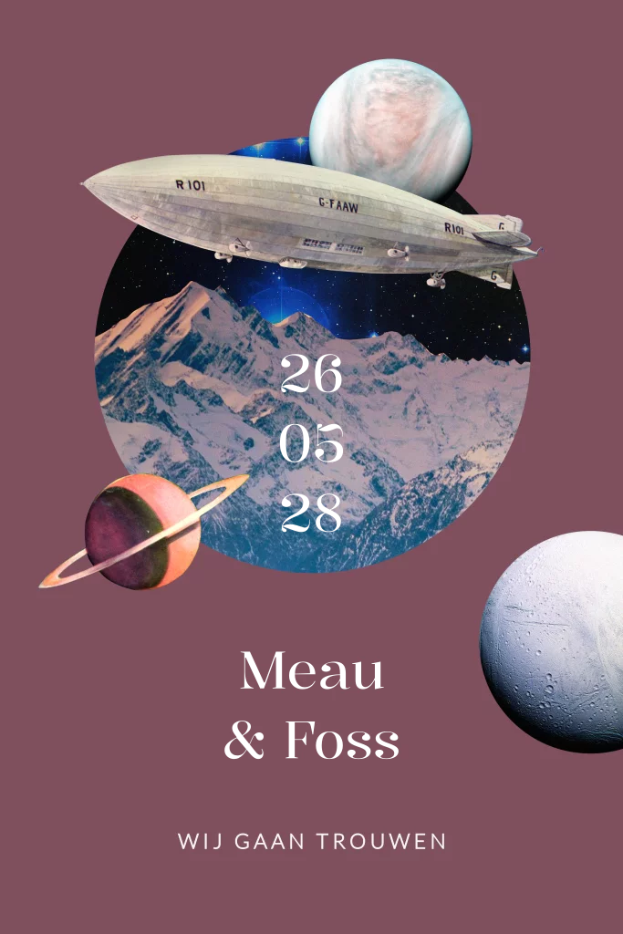 Houden jullie van een beetje out of the box en van het heelal of een berglandschap? Dan past deze kaart helemaal bij jullie! Deze gave trouwkaart met foliedruk is geïnspireerd op de bergen en het heelal. Op de trouwkaart zie je een zeppelin, verschillende planeten en een berglandschap. Verschillende elementen zijn in roségoud foliedruk ontworpen op deze trouwkaart. Foliedruk geeft de trouwkaart een extra luxe uitstraling. Pas deze trouwkaart naar eigen wens aan in de online editor.