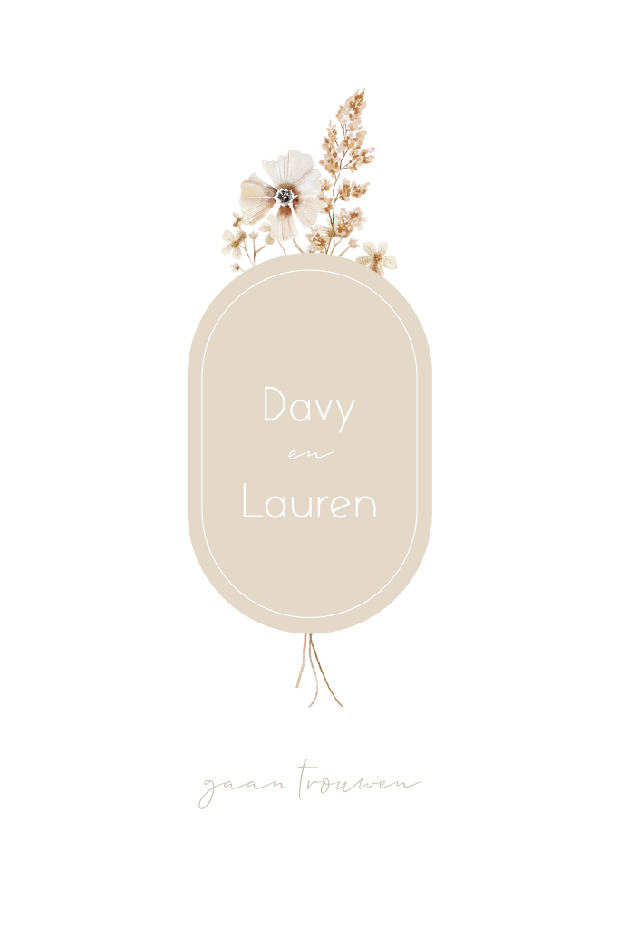 Rustige trouwkaart voor jullie huwelijk met witte achtergrond, beige kader en prachtige veldbloemen. De ovalen rand, jullie namen en trouwdatum worden gedrukt in écht goudfolie wat deze huwelijksuitnodiging een luxe en exclusieve uitstraling geeft. Pas dit kaartje aan naar je eigen wensen in onze editor.