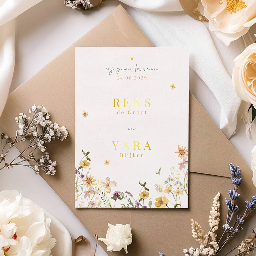 Stijlvolle trouwkaart met prachtige aquarel bloemen en een lichte linnen achtergrond. Dit kaartje past helemaal binnen de bloementrend van nu! De namen van het bruidspaar en de trouwdatum worden gedrukt in écht goudfolie. De folie heeft een mooie glans en geeft deze kaart een extra luxe uitstraling.