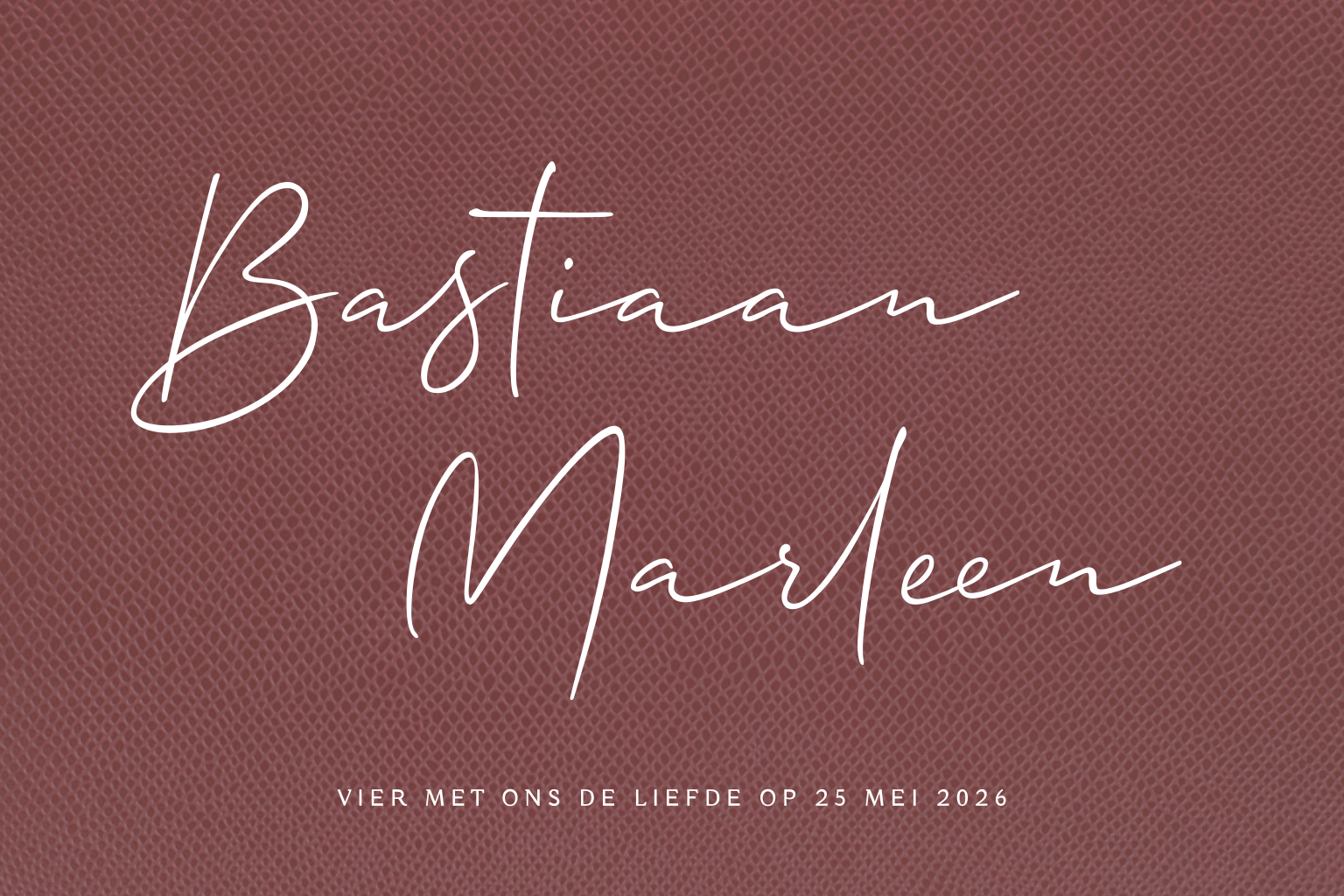 De liefde moet gevierd worden! Op deze trouwkaart met afgeronde hoeken de namen in een sierlijk lettertype in roséfolie. De foliedruk geeft de kaart echt een luxe uitstraling! De kleur van de foliebedrukking pas je in de editor eenvoudig aan. Goud-, zwart-, koper- of zilverfolie is ook mogelijk. Op deze huwelijksuitnodiging een lederlook achtergrond; helemaal hip.