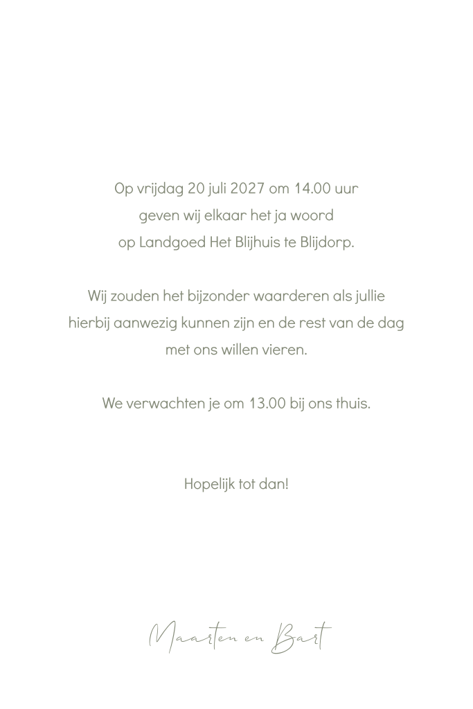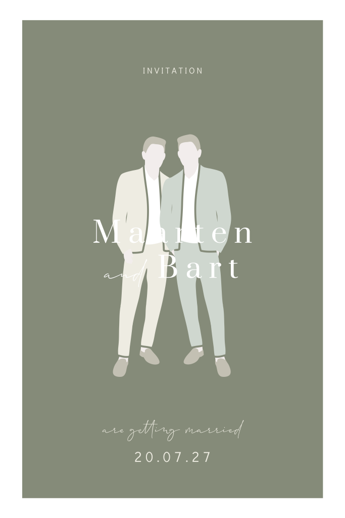Stijlvolle trouwkaart voor een homo huwelijk met een abstract silhouet van 2 mannen. Deze gay huwelijksuitnodiging heeft een mooie groene achtergrond met wit kader, de silhouetten van beide mannen komen hierop mooi naar voren. De namen van het bruidspaar en de trouwdatum worden gedrukt in echt goudfolie. Dat geeft een luxe uitstraling aan deze huwelijksuitnodiging. Pas deze trouwkaart naar je eigen smaak aan in de editor en combineer met een mooie envelop om het helemaal af te maken.