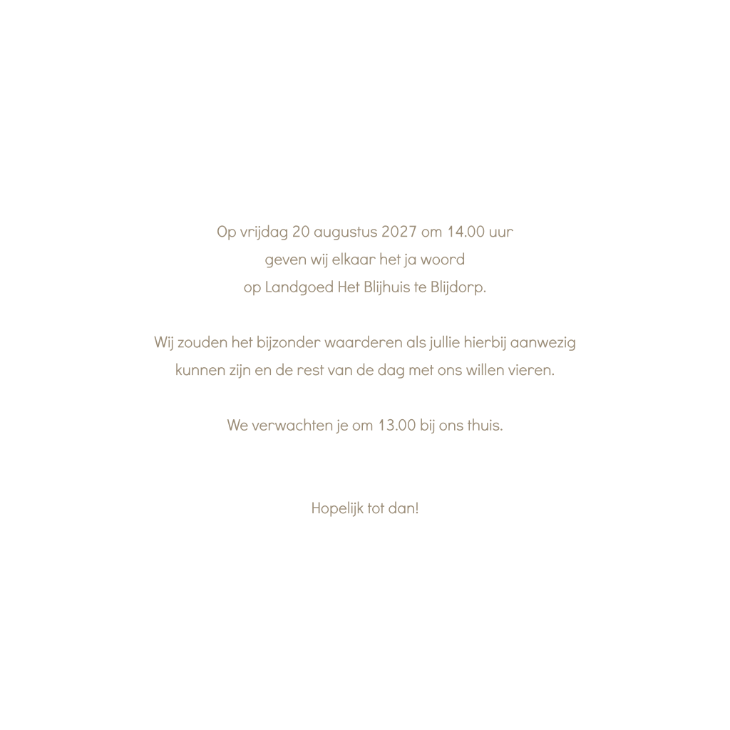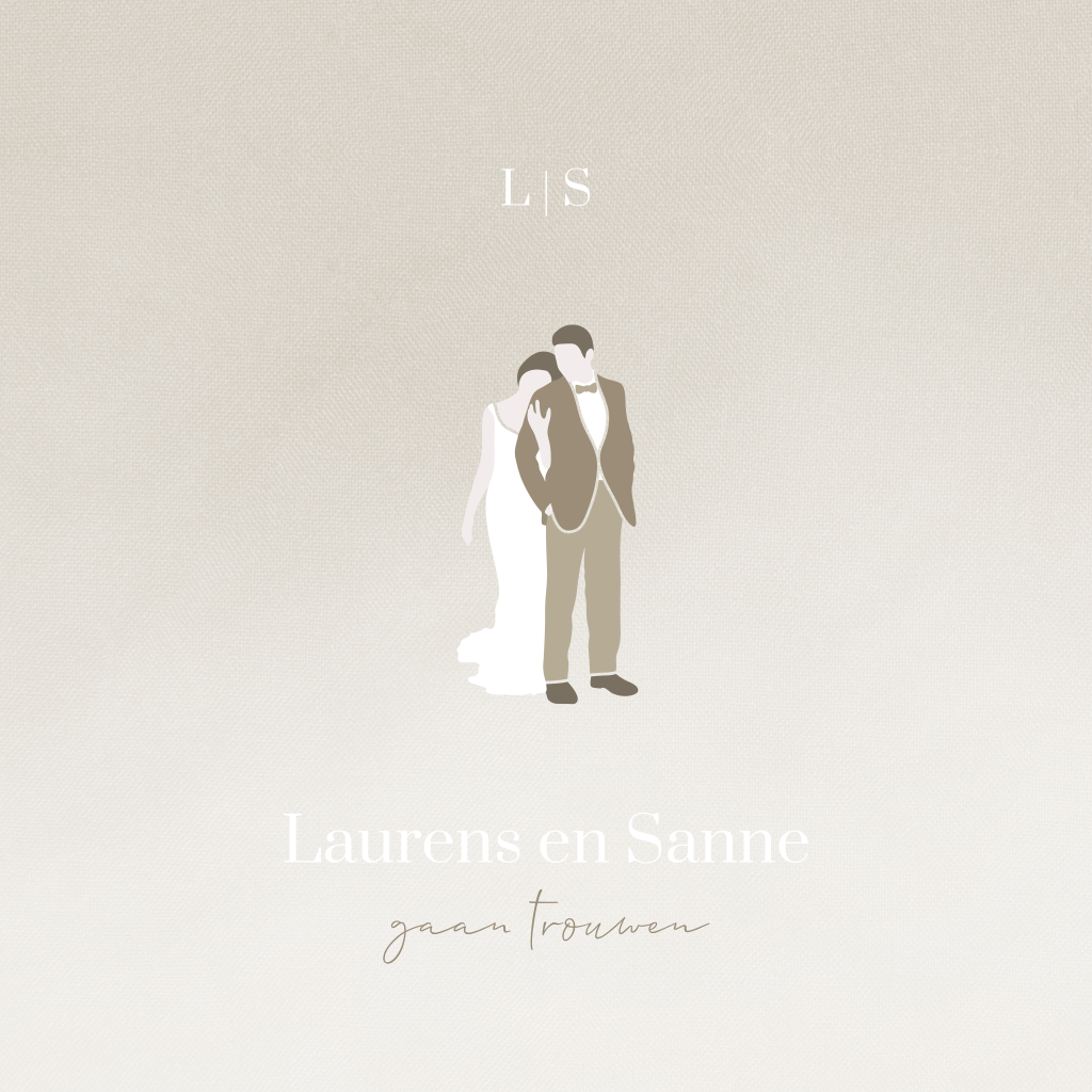 Wanneer je op zoek bent naar een stijlvolle en unieke trouwkaart, kun je niet fout gaan met deze trouwkaart met foliedruk en een silhouet van het bruidspaar. De achtergrond van deze huwelijksuitnodiging heeft een beige kleurverloop met lichte linnenlook. Jullie initialen en namen worden gedrukt in écht goudfolie. Deze kaart is perfect voor een bruiloft en is gemaakt van hoogwaardig materiaal, waardoor je zeker weet dat je kaart er fantastisch uit zal zien.
