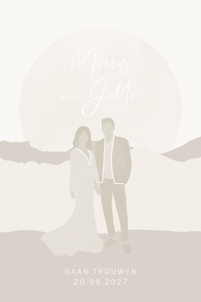 Op zoek naar een unieke trouwkaart? Deze nude trouwkaart met ronde hoeken en foliedruk is helemaal opgemaakt volgens de laatste trends. De beige ton sur ton kleuren in combinatie met de goudfolie geven een rustige en luxe uitstraling. Het mooie silhouet van jullie als bruidspaar staat centraal op de voorgrond met daarachter een berglandschap en ondergaande zon. Pas de huwelijksuitnodiging geheel naar eigen wens aan in de editor.