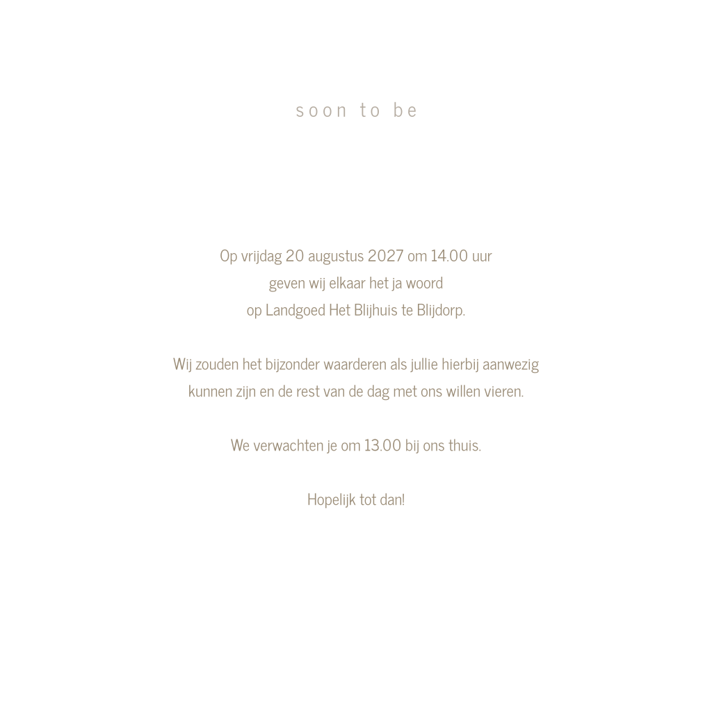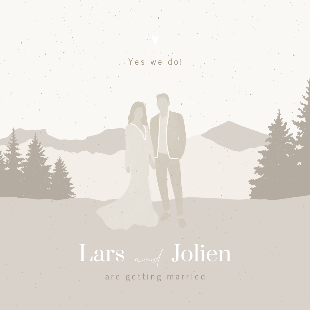 Wanneer je op zoek bent naar een unieke en mooie trouwkaart, dan is deze trouwkaart met silhouet van het bruidspaar in een ton sur ton landschap zeker iets voor jou! De neutrale kleuren, het lichte papiermotief en de goudfolie geven de kaart een luxe uitstraling, perfect voor een speciale gelegenheid.