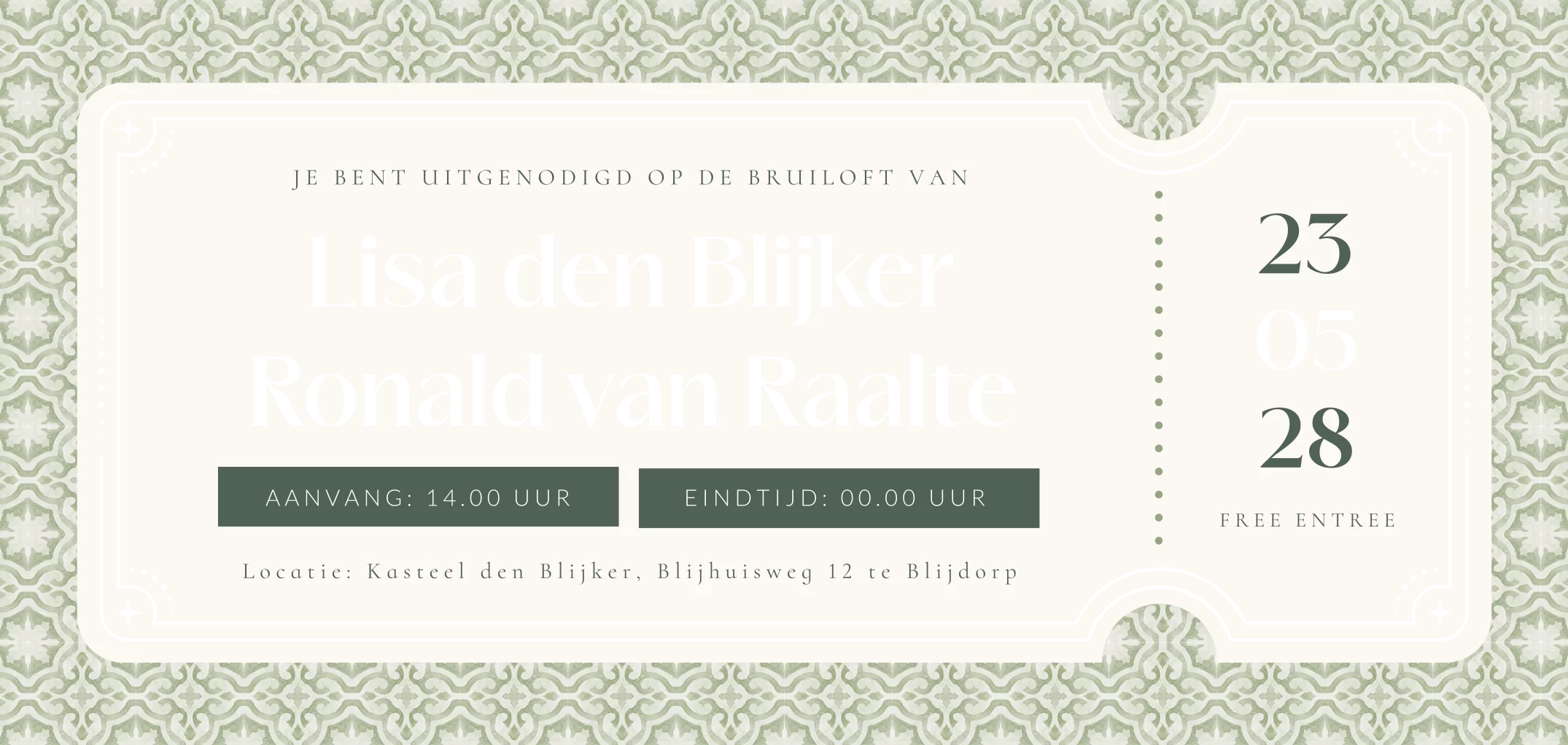 Ben je op zoek naar een unieke, hippe en toch ook stijlvolle trouwkaart? Kies dan voor deze boho stijl trouwkaart in ticketvorm. De kaart is voorzien van een prachtig mintgroen mediterraans patroon van een mediterrane tegel. De toegevoegde foliedruk met afgeronde hoeken zorgt voor een luxe uitstraling. Maak de look compleet met een bijpassende envelop en sluitzegel met hetzelfde mediterraanse patroon.