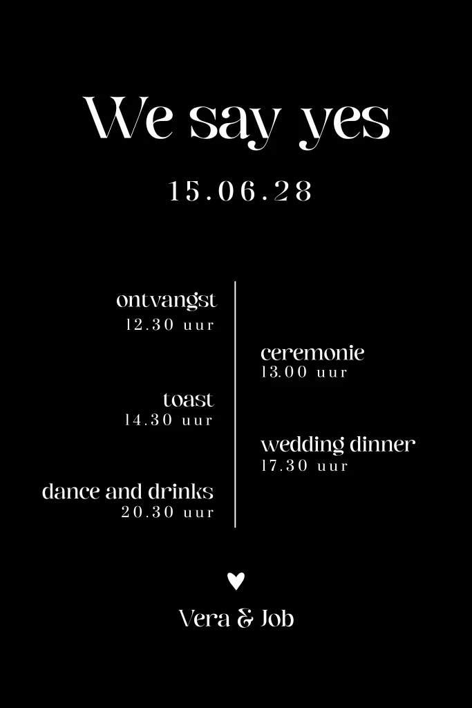 Luxe trouwkaart met tijdlijn om de indeling van dé dag van jullie dromen weer te geven. Op deze uitnodiging voor jullie huwelijk een zwarte achtergrond met daarop witte letters en goudfolie. De folie heeft een mooie glans en geeft de kaart een luxe uitstraling. De ronde hoeken maken het helemaal af.