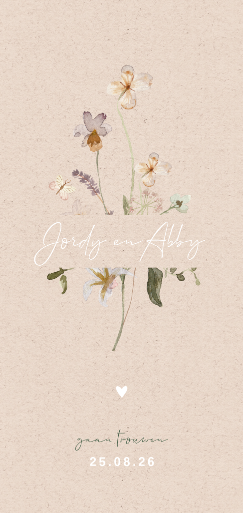 Romantische trouwkaart met kartonlook en afgeronde hoeken. Op deze huwelijksuitnodiging aquarel bloemen met de namen van het bruidspaar ertussen in een sierlijk lettertype en écht goudfolie. De folie heeft een mooie glans en geeft deze kaart een extra luxe uitstraling. De namen en trouwdatum pas je eenvoudig aan in onze editor.