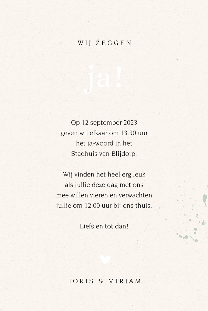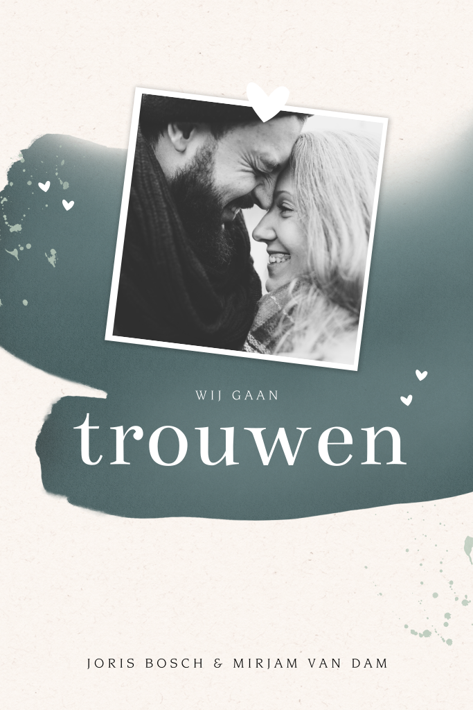 Moderne foto trouwkaart met luxe goudfolie. Op deze huwelijksuitnodiging plaats je een eigen persoonlijke foto. Achter de foto een mooie aquarel veeg en de achtergrond van deze kaart heeft een lichte karton look. De gouden teksten, waaronder het woord 'trouwen' en de kleine hartjes, worden gedrukt in écht goudfolie. Dit geeft je kaart een exclusieve uitstraling. Wil je liever koperfolie, zilverfolie, roséfolie of zwartfolie? Dit kun je zelf aanpassen in de editor.