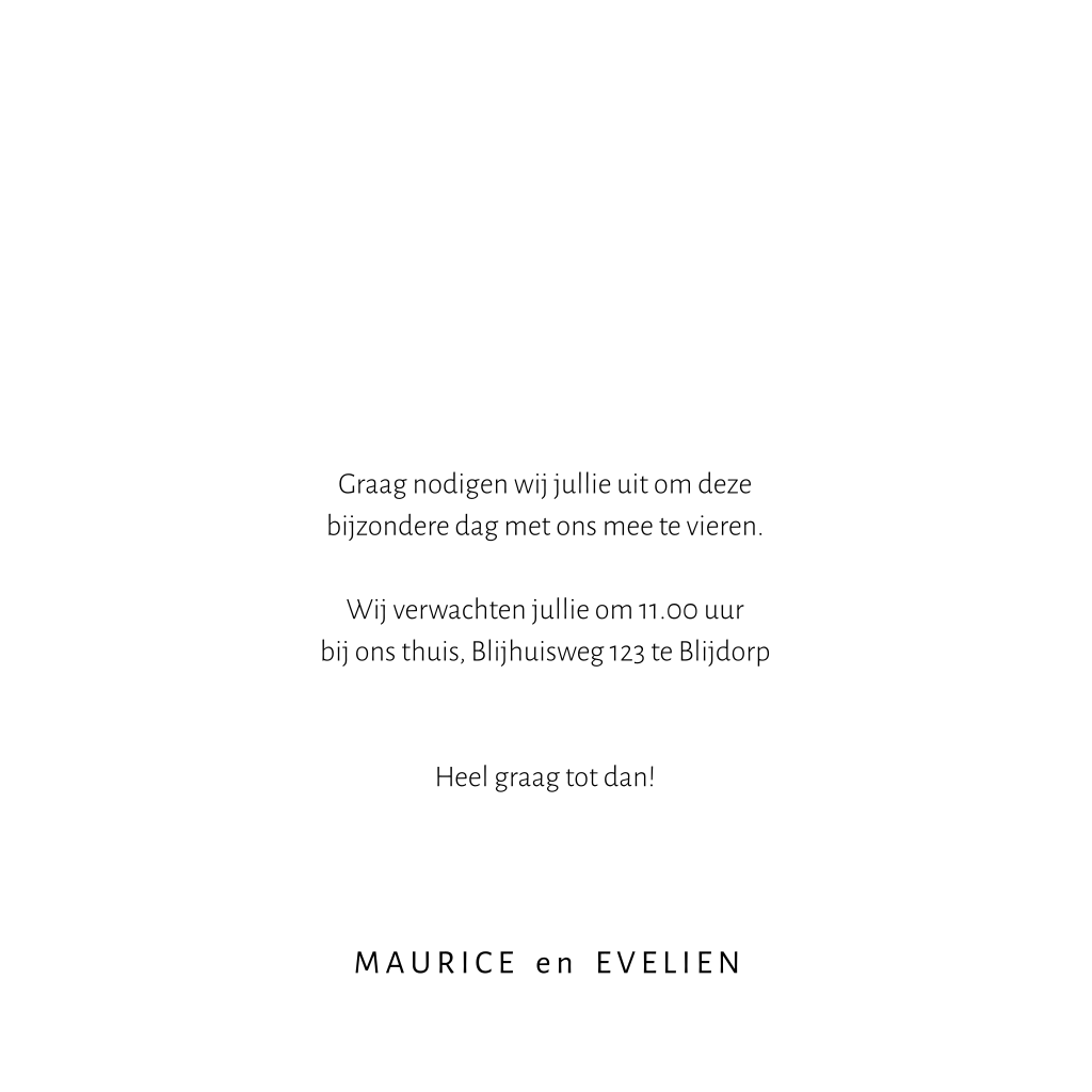 Luxe Mr & Mrs trouwkaart met echt goudfolie. Op de binnenzijde staat het dagprogramma weergegeven met symbolen welke ook met echt goudfolie worden gedrukt. Verder is de kaart clean, maar door het goudfolie een exclusieve uitnodiging. Ook mooi met zilverfolie, koperfolie of roséfolie.