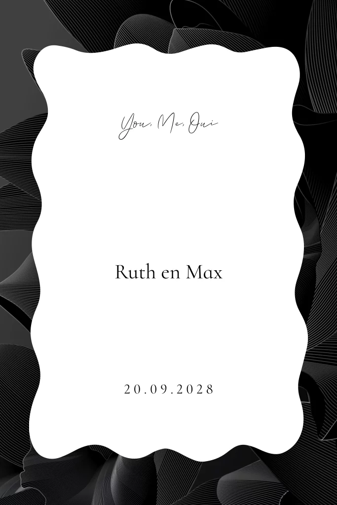 Met een prachtig geometrisch en organisch patroon gecombineerd met zwart en wit en gouden foliedruk straalt deze exclusieve trouwkaart elegantie uit en voegt het een origineel tintje toe aan elke bruiloft. Bestel vandaag nog deze trouwuitnodiging met initialen, folie en golvend kader en maak jullie speciale aankondiging compleet. Combineer met een mooie envelop en sluitzegel om het helemaal af te maken.