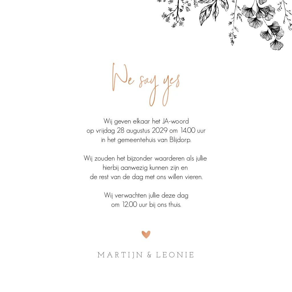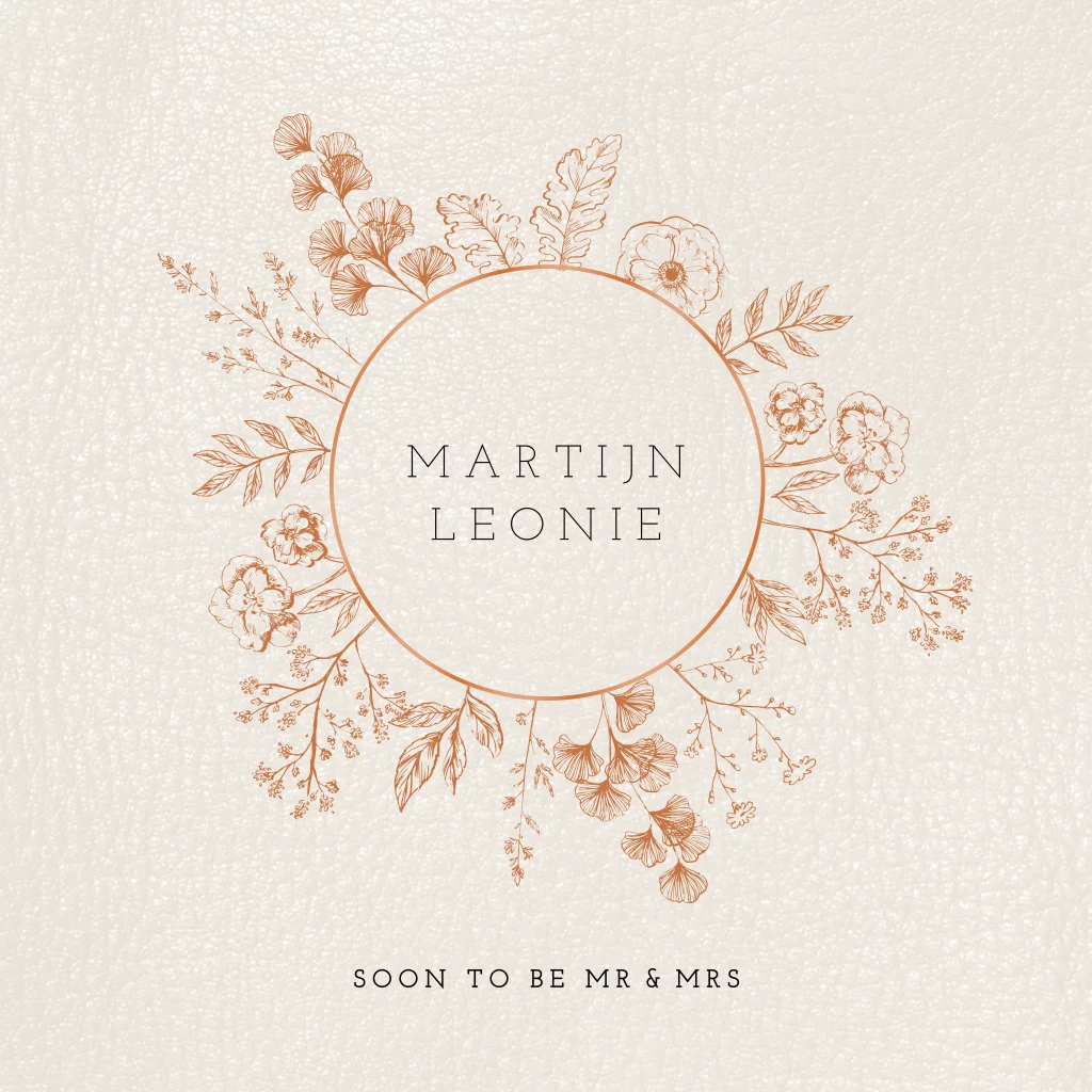 Stijlvolle hoogglans trouwkaart met getekende bloemen. Op deze huwelijksuitnodiging staan de namen van het bruidspaar in een cirkel met daaromheen getekende bloem takjes in hoogglans. De hoogglans heeft een mooie glans en springt er helemaal uit in combinatie met de beige leather look achtergrond. Je kunt deze kaart zelf bewerken en naar je eigen smaak aanpassen. De kleur van de folie kun je makkelijk aanpassen naar goudfolie, zilverfolie of roséfolie.