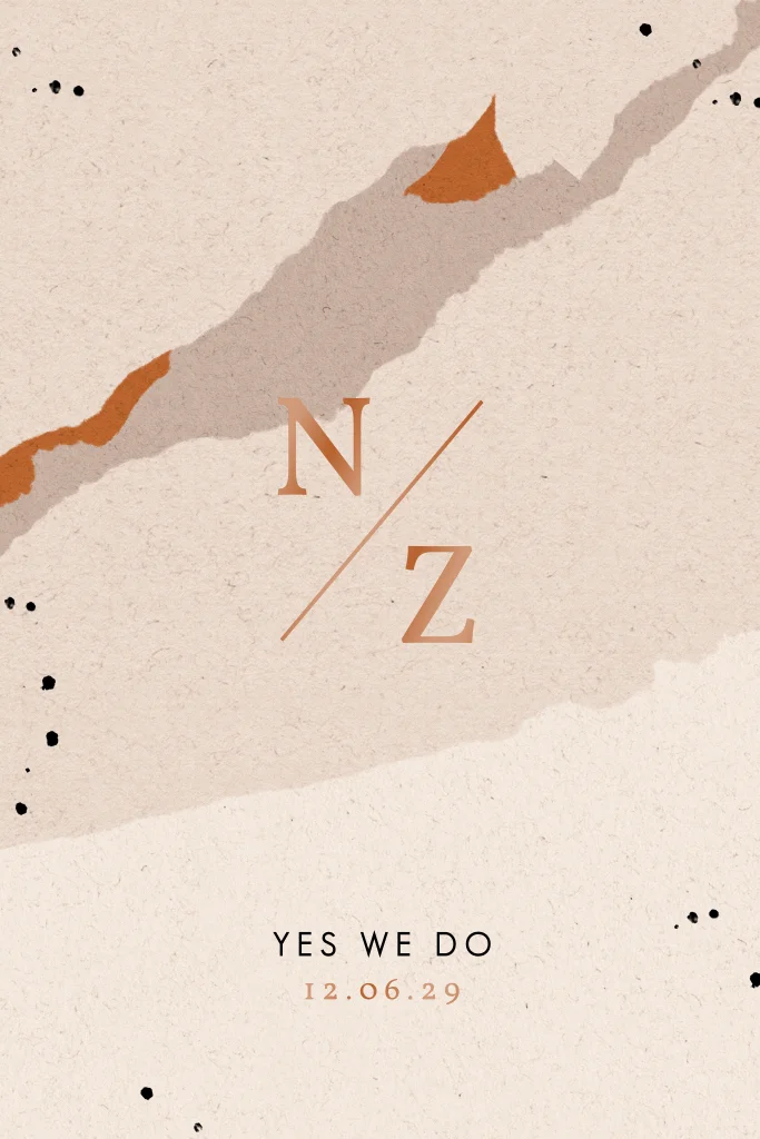 Luxe huwelijksuitnodiging met initialen en hoogglans. Deze trouwkaart heeft op de achtergrond verschillende lagen karton, wat ook wel wat oogt als gescheurd papier. De koperkleurige elementen op de voor- en achterzijde worden gedrukt in hoogglans, waaronder de voorletters van het bruidspaar en de kleine spetters. Hoogglans geeft deze kaart extra luxe uitstraling. Bewerk deze kaart naar je eigen smaak in de editor. Ook mogelijk met goudfolie, zilverfolie of roséfolie.