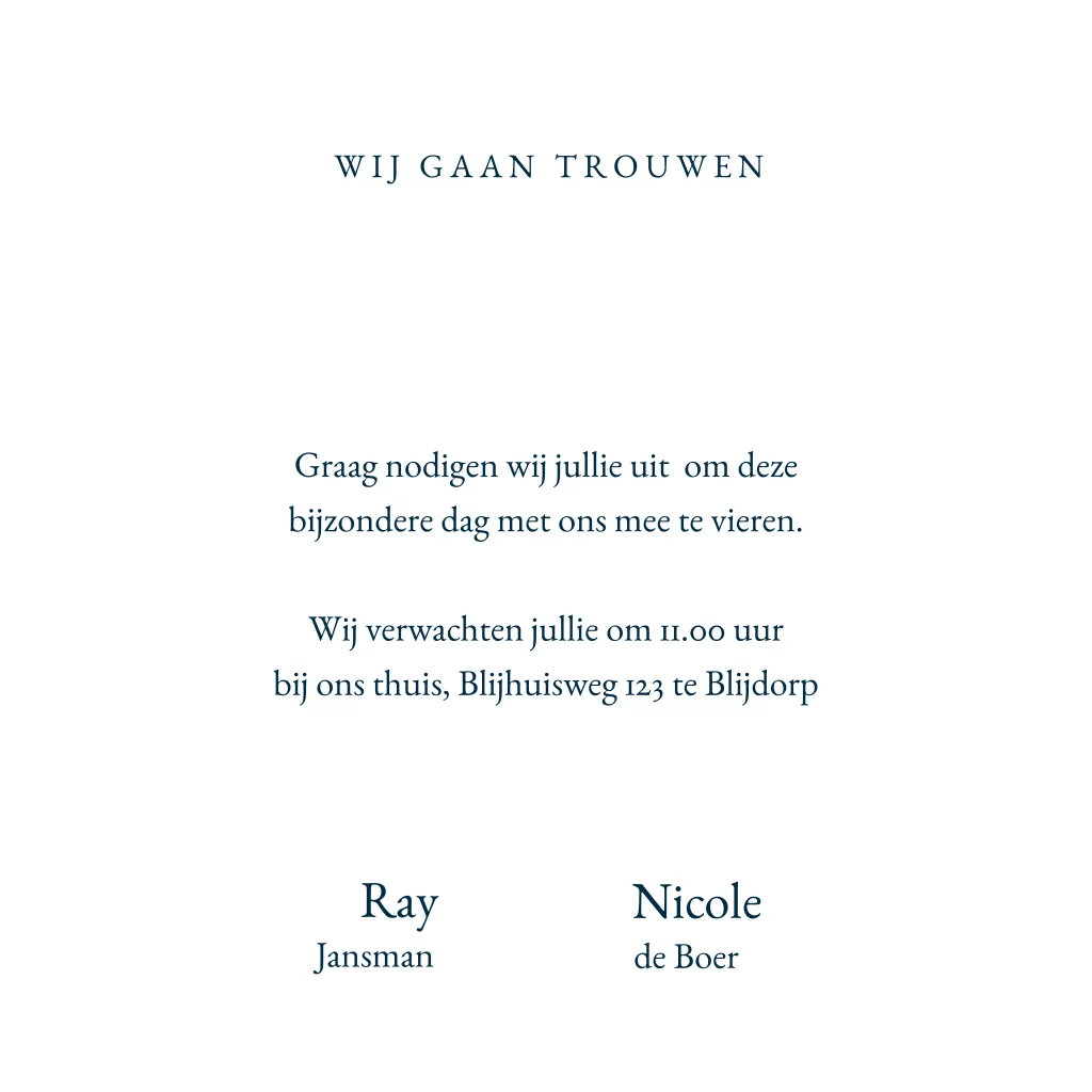 Luxe goudfolie huwelijksuitnodiging met de initialen van het aanstaande bruidspaar. Deze kaart wordt gedrukt met echt goudfolie. Aan de binnenzijde wordt met symbolen het dagprogramma weergegeven. De kleuren van deze exclusieve trouwkaart zijn gemakkelijk aan te passen. Ook mooi met zilverfolie of roséfolie.