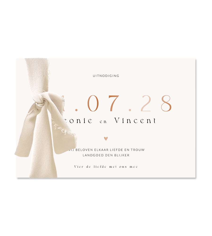Op zoek naar een stijlvolle trouwkaart met een moderne uitstraling? Ontdek deze trouwkaart met lint, hoogglans en een clean design. De toevoeging van hoogglans op de kaart en envelop in metallic brons zorgt voor een luxe uitstraling, terwijl de eenvoudige en moderne vormgeving de kaart tijdloos maakt.