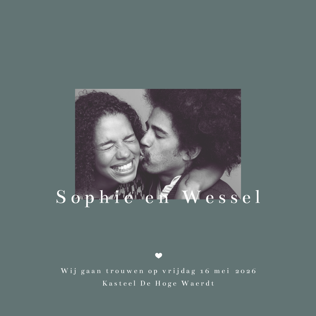 Foto trouwkaart met een strak design. Wat deze kaart extra bijzonder maakt, is dat de namen van het bruidspaar en het kleine hartje worden gedrukt in écht roséfolie. Foliedruk geeft je kaart een extra luxe uitstraling. Een mooie combinatie met de groene achtergrondkleur. Voeg een mooie foto toe van jullie zelf en maak van deze kaart je eigen persoonlijke huwelijksuitnodiging. Ook mogelijk met goudfolie, zilverfolie, koperfolie of zwartfolie.