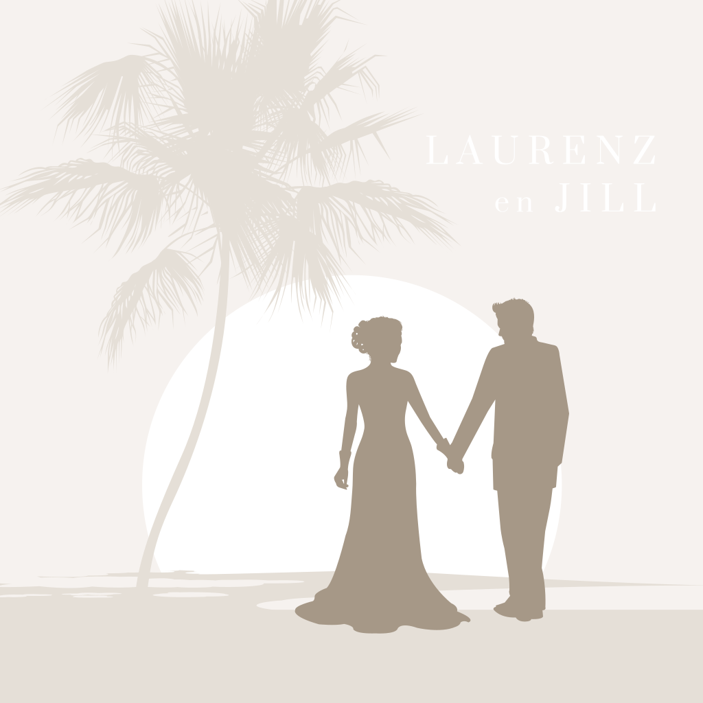 Silhouet trouwkaart in rustige natuurtinten. Op deze kaart staat een silhouet van jullie als stralend stel. Op de achtergrond zakt de zon in de zee en naast jullie staat een palmboom. Deze trouwkaart geeft een echt zomer gevoel!