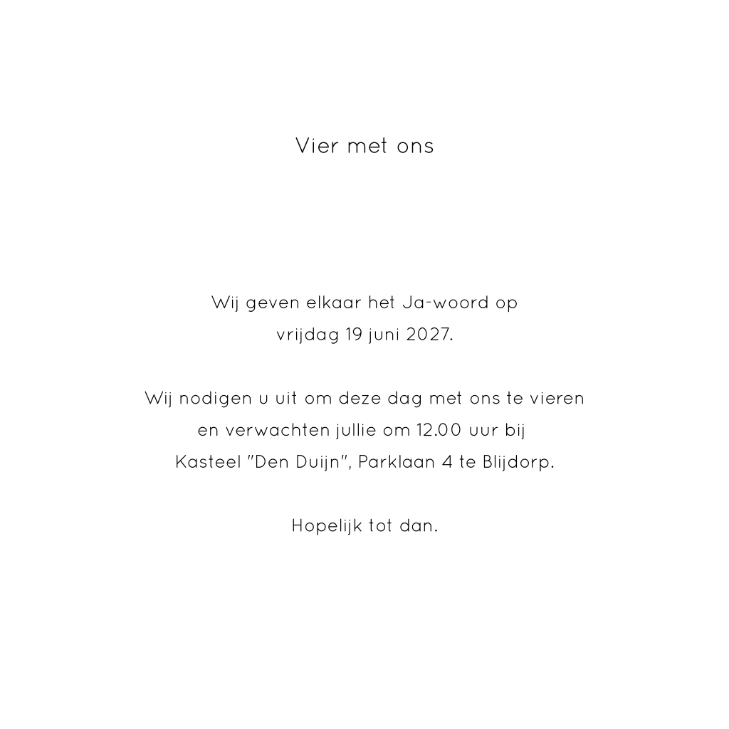De kleuren en lettertypes van deze huwelijksuitnodiging kun je aanpassen in de editor. Hulp nodig? We helpen je graag.