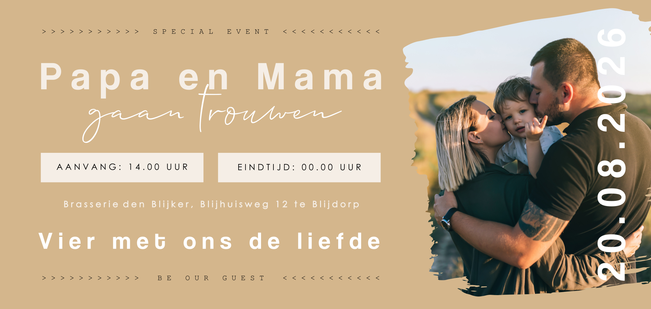 De kleuren en lettertypes van deze huwelijksuitnodiging kun je aanpassen in de editor. Hulp nodig? We helpen je graag!