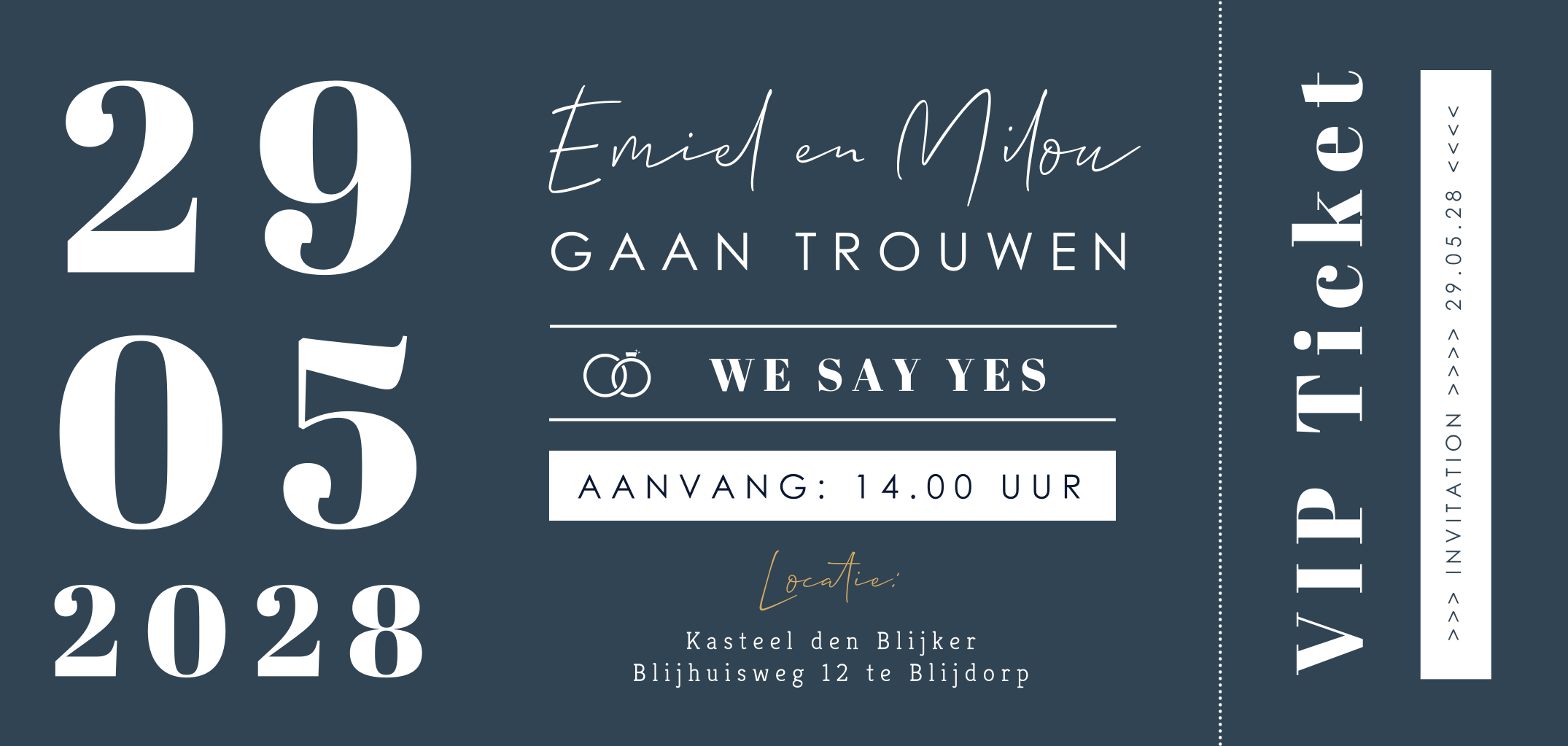 Exclusieve typografische trouwkaart in ticket stijl. Nodig je gasten uit als echte VIP's uit op jullie bruiloft. De gouden tekst en de trouwringen worden gedrukt in echt goudfolie. Een erg mooie combinatie met de donkerblauwe achtergrond. De folie heeft een mooie glans en geeft je kaart een extra luxe uitstraling.