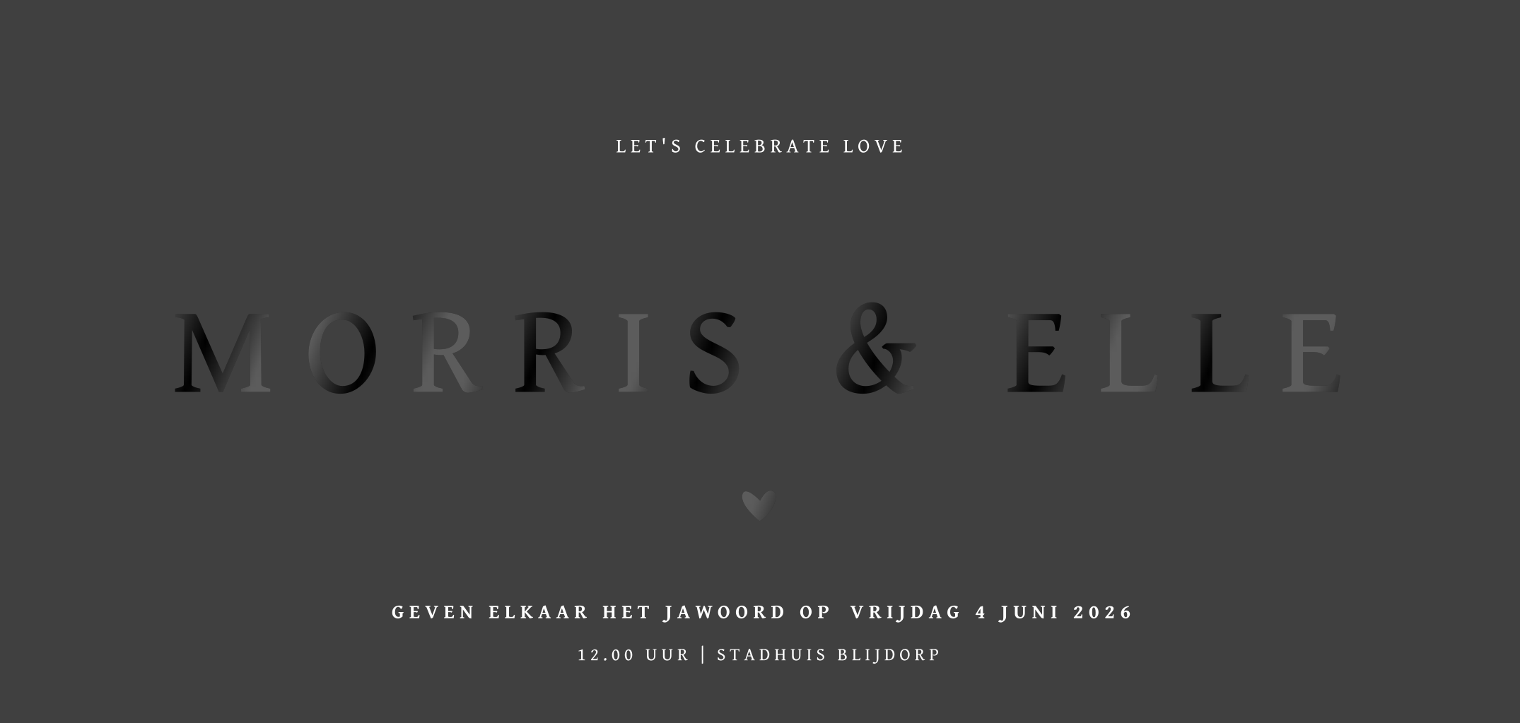 Moderne trouwkaart met een strak design. Op deze huwelijksuitnodiging is een donkergrijze achtergrondkleur gecombineerd met tekst in écht zwartfolie. Een super gave combinatie! Door de zwartfolie op het kaartje krijgt deze uitnodiging een extra luxe uitstraling. Jullie namen spatten hiermee van de kaart af! De teksten zijn aan te passen in de editor.