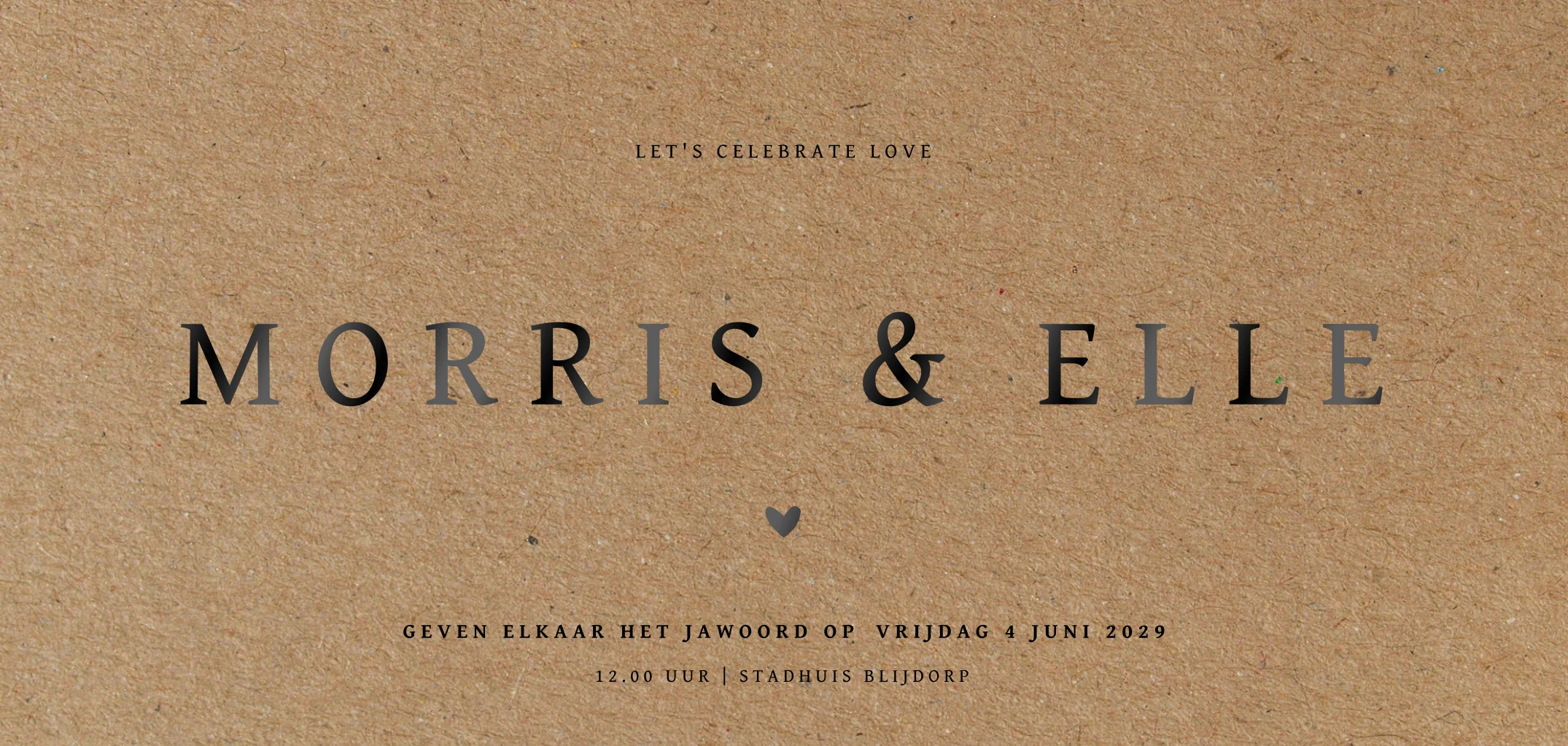 Strakke trouwkaart op een kraft karton achtergrond, wat de kaart een mooie kartonlook geeft. Op deze huwelijksuitnodiging is zwarte tekst gecombineerd met tekst in écht zwartfolie. De namen en het hartje worden in écht zwartfolie gedrukt. Een erg mooie en stoere combinatie met de kartonlook. De teksten zijn aan te passen in de editor.