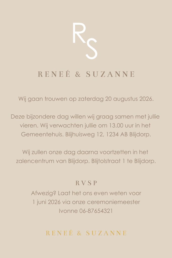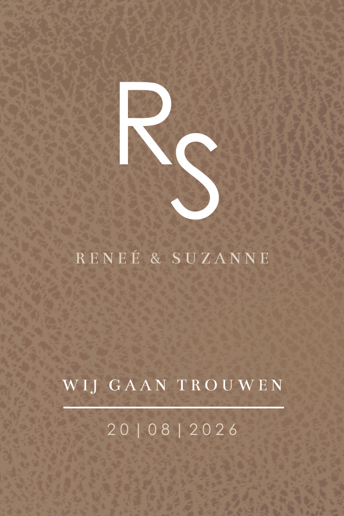 Prachtige trouwkaart met o.a. de initialen van het stralende bruidspaar in glanzend goudfolie, wat echt een exclusieve uitstraling geeft! Ook mogelijk in andere kleuren foliebedrukking. Dit pas je eenvoudig aan in onze ontwerpmodule. Op deze huwelijksuitnodiging met afgeronde hoeken een stijlvolle lederlook achtergrond.