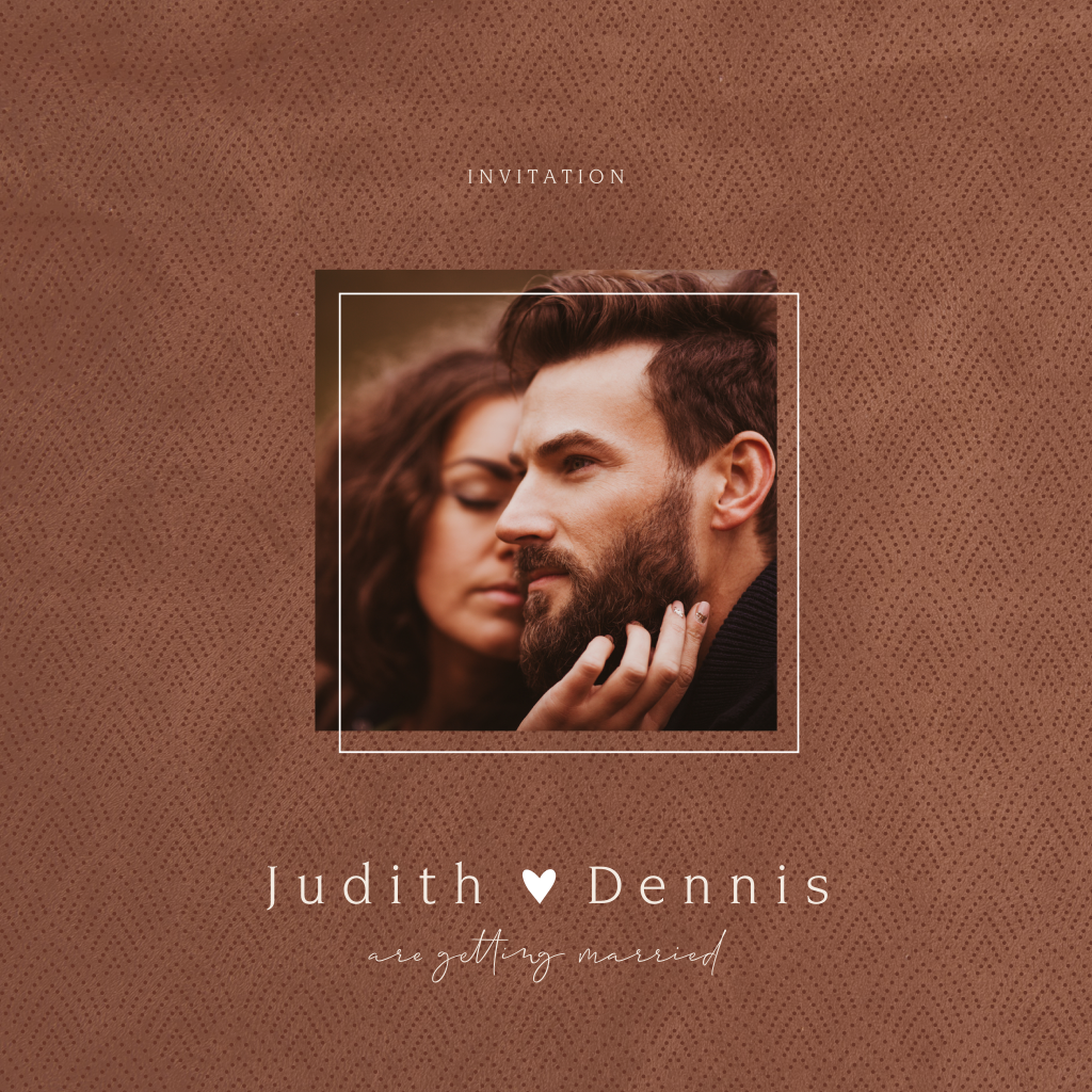 Bijzondere trouwkaart met een artdeco leerlook achtergrond. Rondom de foto een subtiel kader in gouden foliedruk.
