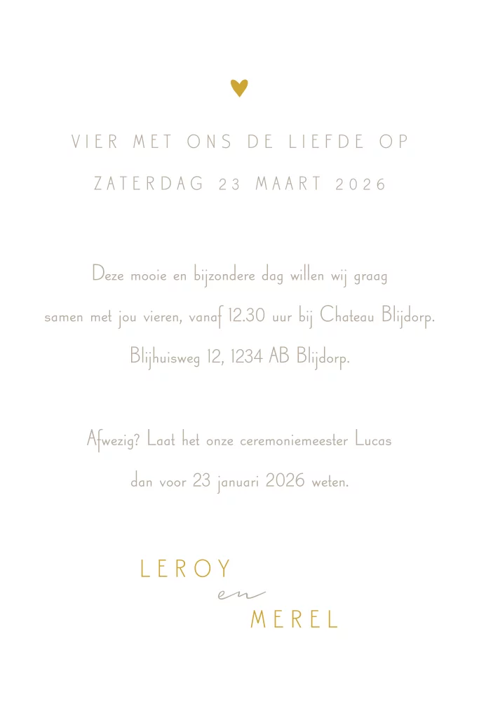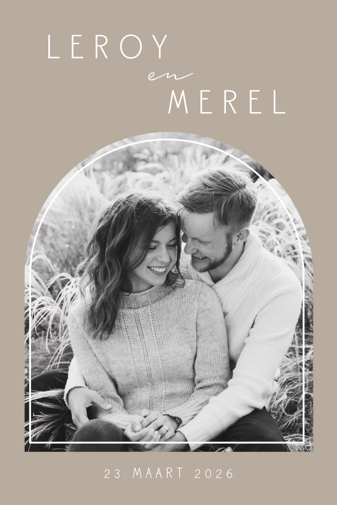 Luxe trouwkaart met afgeronde hoeken én goudfolie. De glanzende folie geeft echt een exclusief tintje aan jullie prachtige, persoonlijke huwelijksuitnodiging. De kleur van de foliebedrukking pas je eenvoudig aan in onze ontwerpmodule. Op deze trouwkaart alle ruimte voor jullie eigen, meest liefdevolle foto. De foto wordt geplaatst in een goudfolie kader met een boogvorm. Aanpassingen of speciale wensen? Laat het ons gerust weten als je hulp nodig hebt!