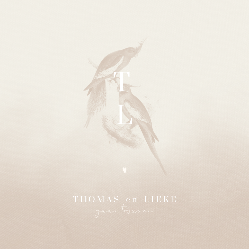 Rustige vogel trouwkaart met initialen, linnenlook en goudfolie