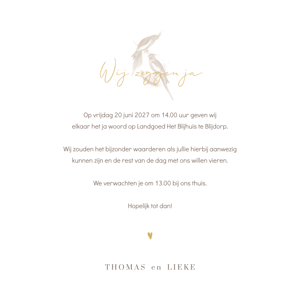 Wanneer je op zoek bent naar een unieke en luxe trouwkaart, dan is deze huwelijksuitnodiging met vogels en goudfolie perfect voor jou! Deze kaart is gemaakt van hoogwaardig papier met een aquarel vintage linnenlook. De initialen en namen van jullie als bruidspaar worden gedrukt in écht goudfolie, wat de kaart een unieke en bijzondere touch geeft.