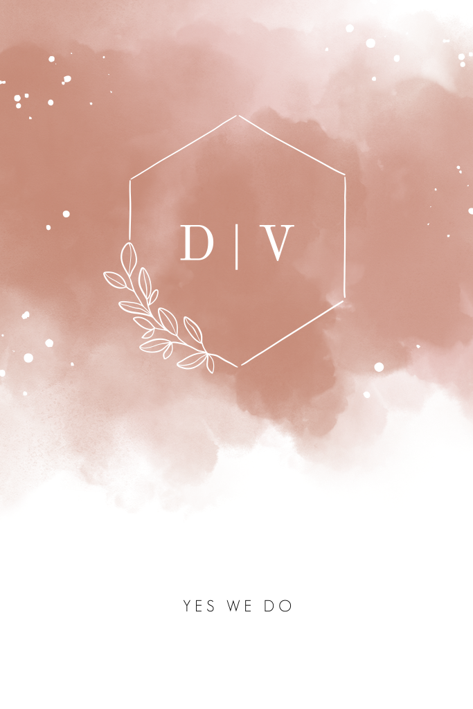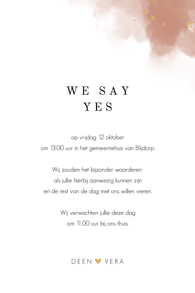 Stijlvolle huwelijksuitnodiging met een aquarel achtergrond. Op deze trouwkaart staat een kader met een klein takje. In het kader staan de initialen van het bruidspaar. De gouden elementen op de voorzijde, waaronder het kader, de spetters en de hartjes, worden gedrukt in écht goudfolie. Folie geeft je kaart een extra luxe uitstraling. Wil je meer elementen op deze kaart in folie? Neem dan even contact met ons op. Ook mogelijk met koperfolie, roséfolie, zilverfolie of zwartfolie.