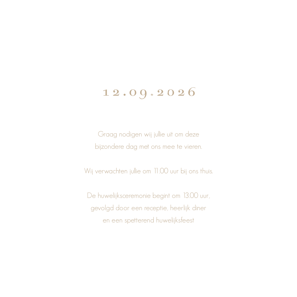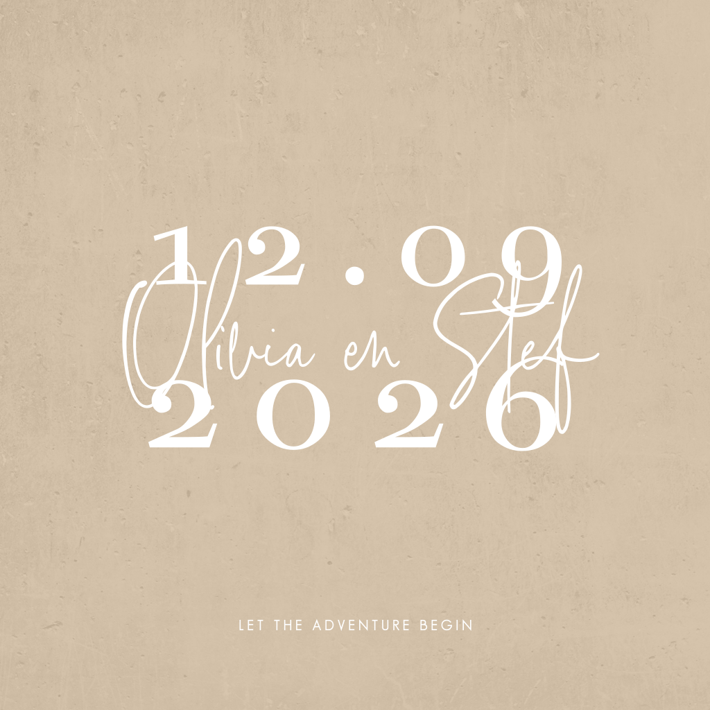 Prachtige trouwkaart met foliedruk. Op deze trouwkaart springen de namen van het bruidspaar en de trouwdatum er helemaal uit. Een mooie warme zand kleur achtergrond kleur gecombineerd met witte tekst. De namen staan in een sierlijk lettertype en worden gedrukt met echt goudfolie. De transparante betonlook op de achtergrond geeft deze kaart ook een vintage uitstraling. Ook mogelijk met koperfolie, zilverfolie of roséfolie.