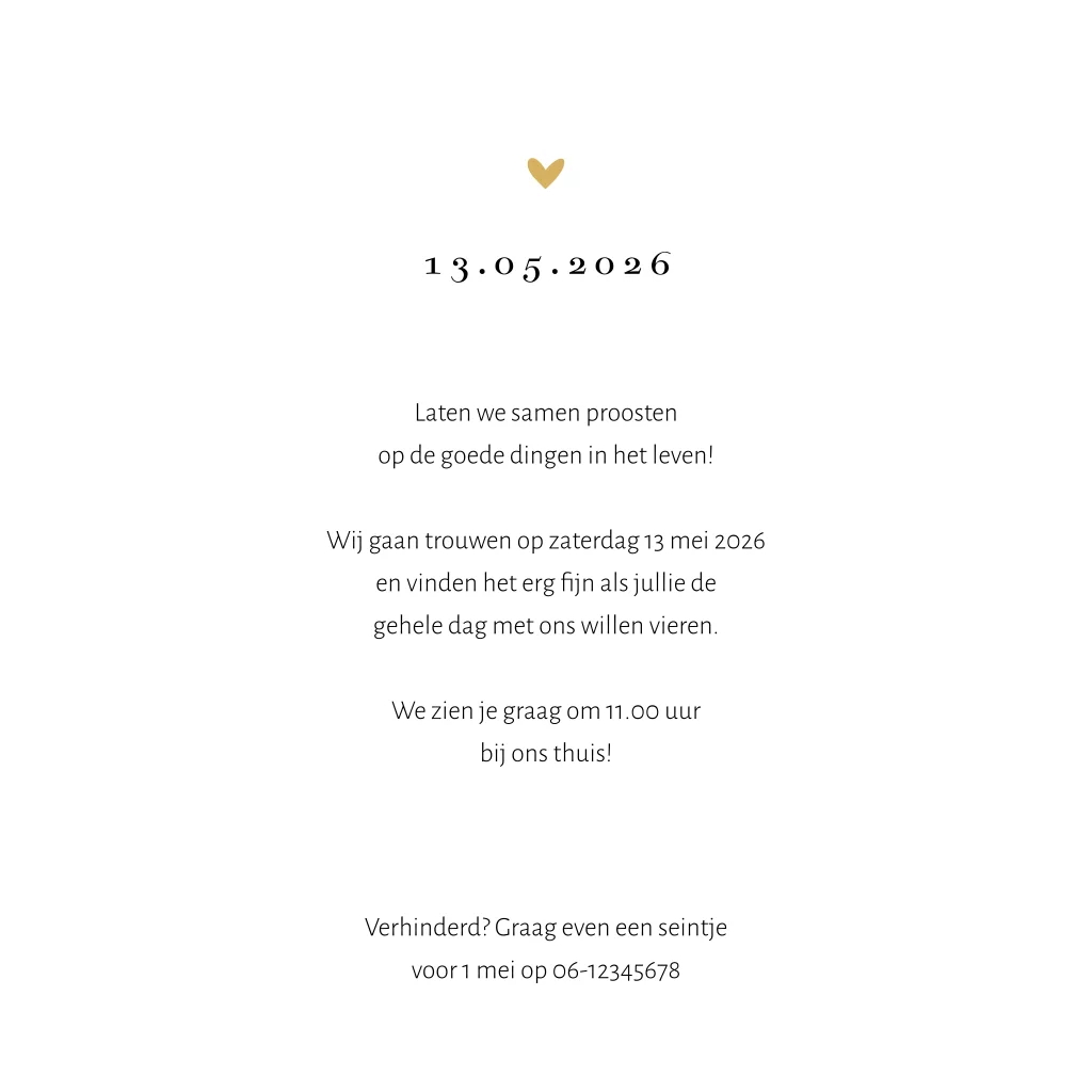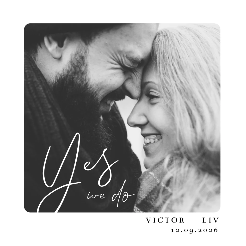 Hippe foto trouwkaart met foliedruk. Op deze huwelijksuitnodiging wordt de tekst "Yes we do" en het hartje op de voor- en achterkant gedrukt in echt goudfolie. Dit geeft de kaart een exclusieve uitstraling. Wil je liever koperfolie, zilverfolie of roséfolie? Dit is gemakkelijk aan te passen in de editor.