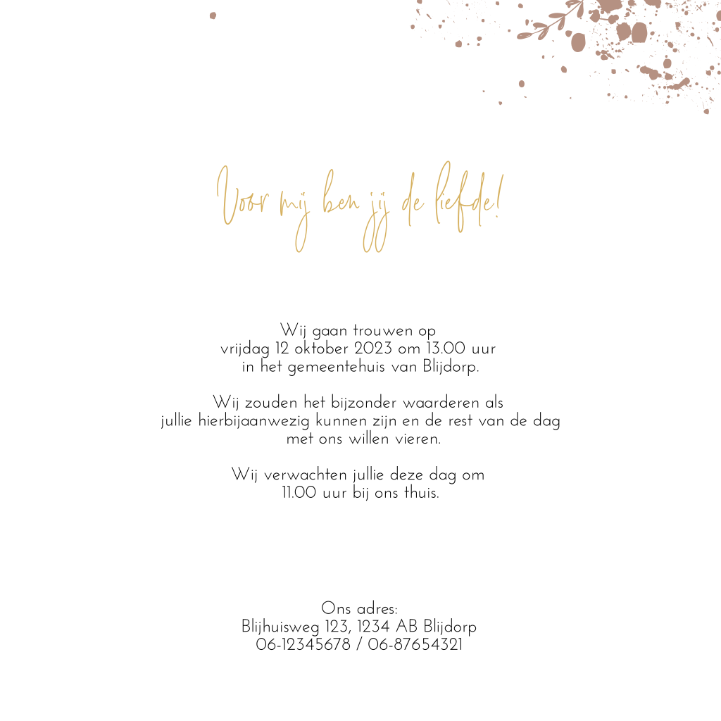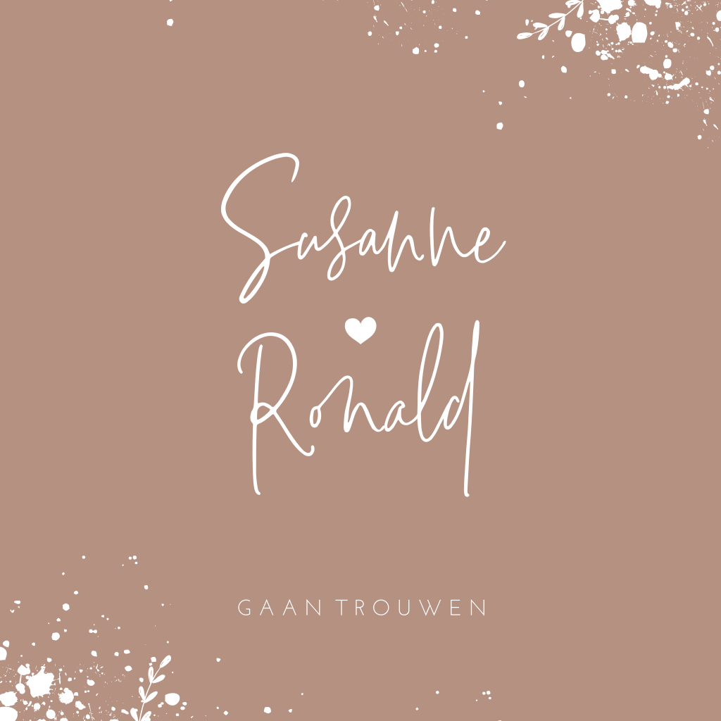 Trouwkaart in een mooie trendy kleurencombinatie van oud roze met wit en goudkleur. De namen van het bruidspaar staan in een sierlijk lettertype en komen mooi naar voren. De gouden spetters, takjes en hartjes op de voorzijde worden gedrukt in echt goudfolie. Dat geeft deze kaart een extra luxe uitstraling. De kleuren en teksten zijn aan te passen in de editor. Ook mogelijk met koperfolie, zilverfolie of roséfolie.