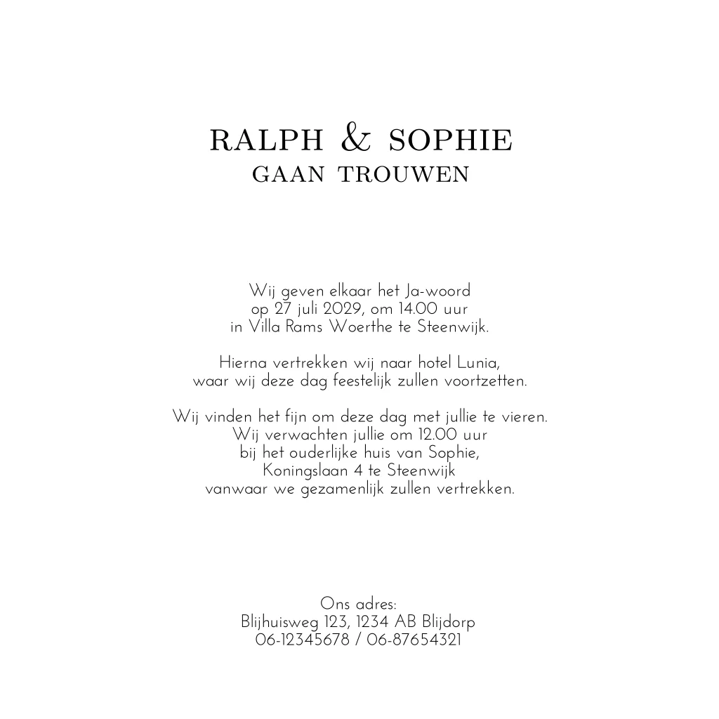 Basic trouwkaart met een minimalistisch design. Op de voorzijde van deze huwelijks uitnodiging worden de initialen gedrukt in echt goudfolie. Goudfolie geeft de kaart een exclusieve uitstraling. Pas de kaart naar wens aan in onze editor. De kleur is aan te passen naar zilverfolie of roséfolie.