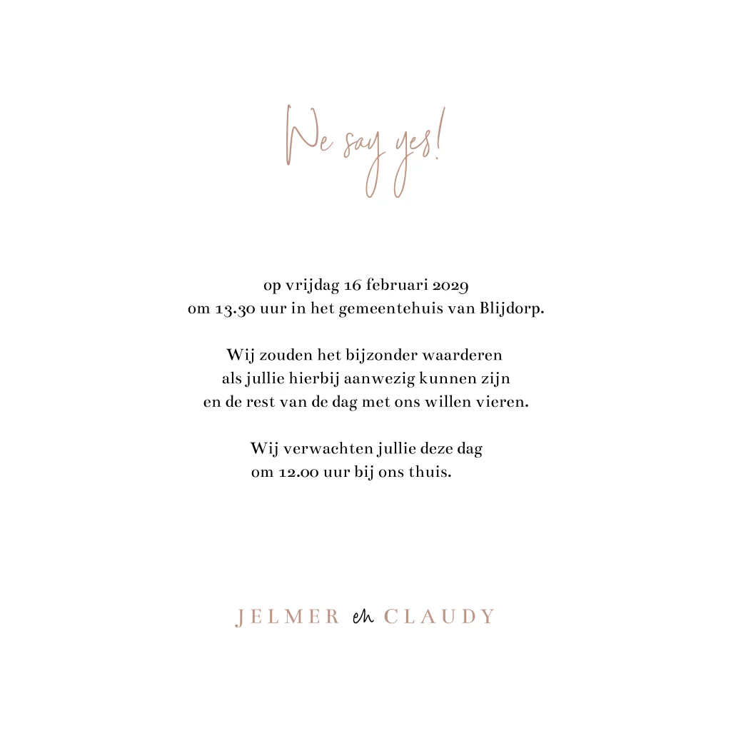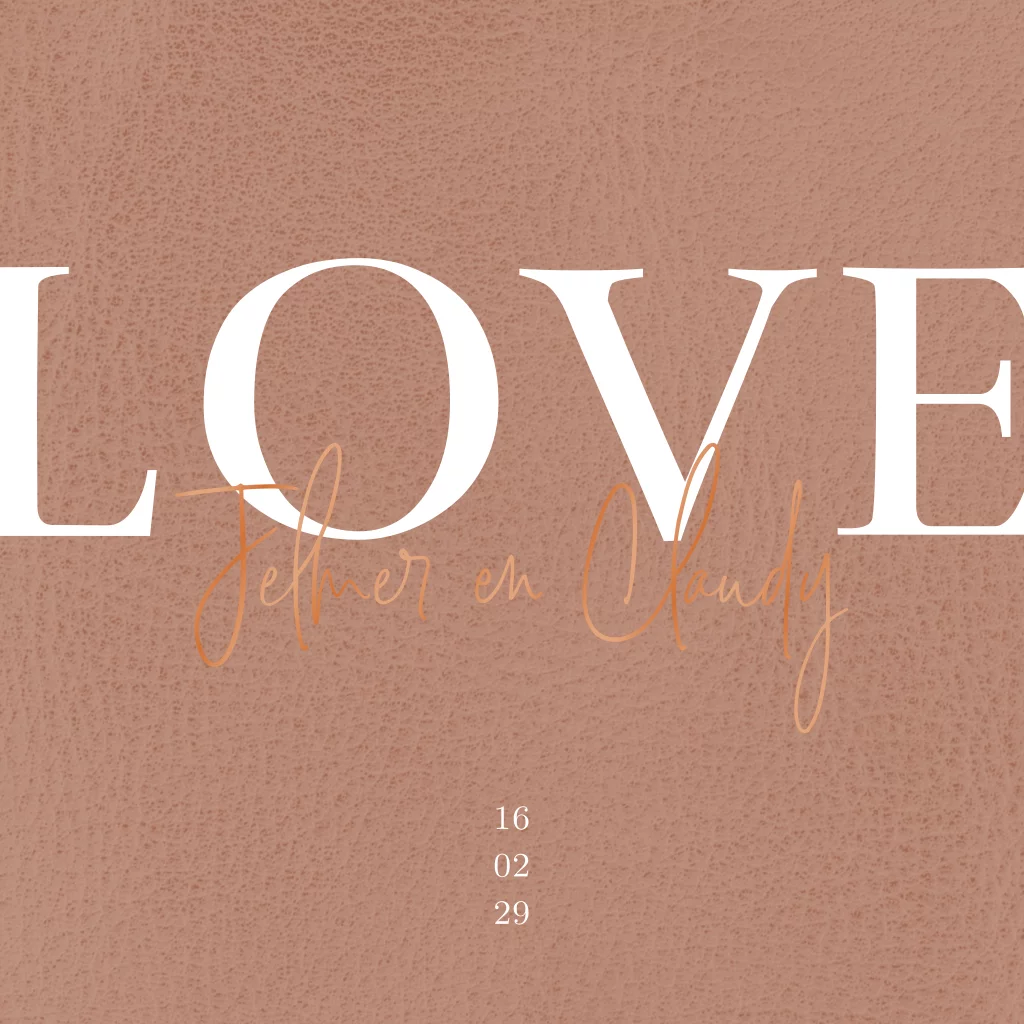 Mooie basic huwelijksuitnodiging in oud roze met wit en hoogglans. Op de voorzijde staat groot het woord "Love" met daaronder de namen van het bruidspaar in mooie sierlijke letters. Doordat de namen gedrukt worden in hoogglans, krijgt deze trouwkaart een luxe uitstraling. De ruwe achtergrond geeft een mooi effect. Liever andere kleuren of lettertypes? Dit is gemakkelijk aan te passen in de editor. Ook mogelijk met goudfolie, zilverfolie of roséfolie.