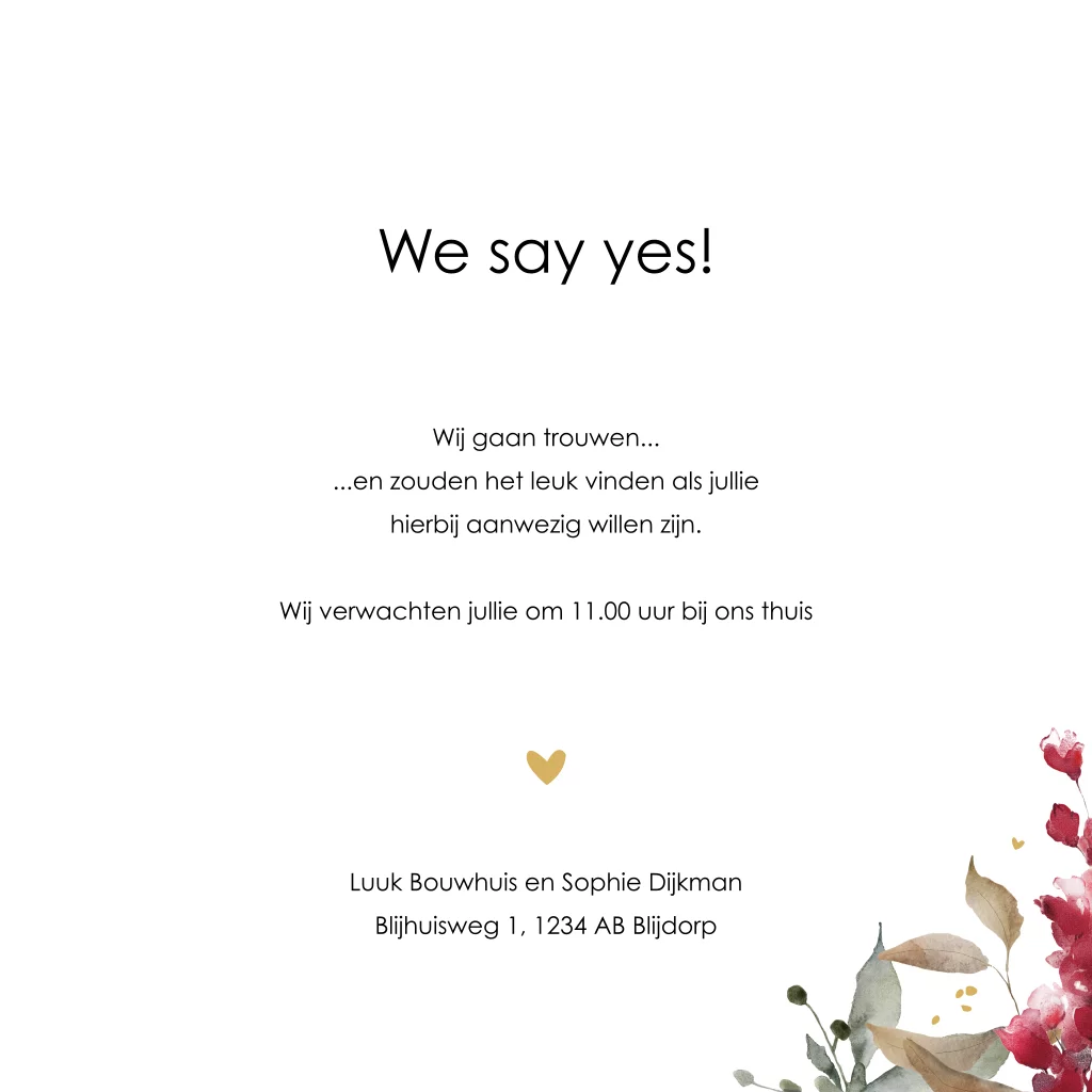 We say yes! Romantische trouwkaart met bloemen en goudfolie. gouden elementen op de voorkant van de kaart worden gedrukt in echt goudfolie. Dit geeft een exclusieve uitstraling. De binnenzijde van de kaart is voorzien van symbolen. De kleur van de folie is gemakkelijk aan te passen naar zilverfolie, roséfolie of holografisch folie.