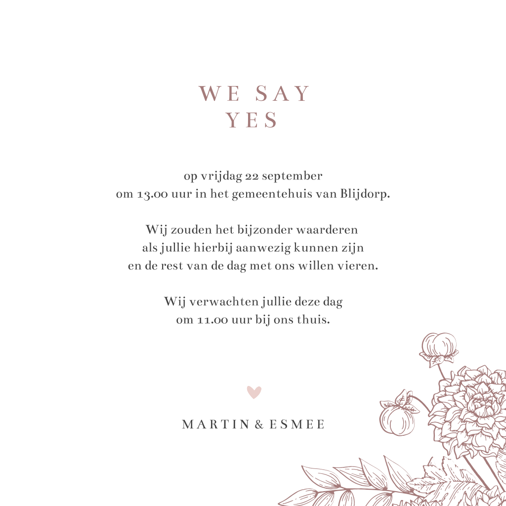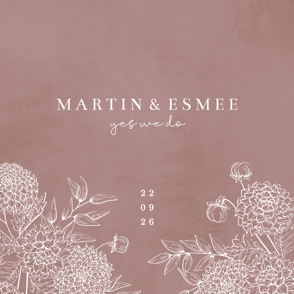 Luxe trouwkaart in trendy lila kleur met roséfolie en getekende bloemen. De namen van het bruidspaar staan in een strak lettertype en komen in het wit mooi naar voren. Wat deze trouwkaart extra speciaal maakt, is dat de getekende bloemen op de voorzijde en de tekst 'Yes we do" gedrukt worden in écht roséfolie. Folie geeft een mooie glans en zorgt voor een luxe uitstraling. De ruwe achtergrond geeft een mooi effect. Lettertypes en kleuren zijn aan te passen in de editor. Ook de kleur van de folie kun je makkelijk wijzigen naar goudfolie, zilverfolie, koperfolie of zwartfolie.