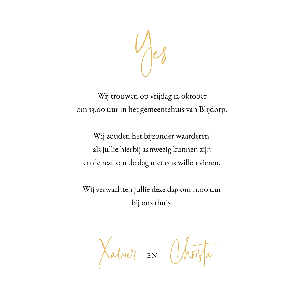 Yes we Do en de namen van het bruidspaar op de voorzijde worden gedrukt met echt goudfolie. Dat geeft je kaartje een extra luxe uitstraling. Deze huwelijksuitnodiging heeft een sierlijk en speels lettertype. Verder is de kaart rustig en overwegend wit.