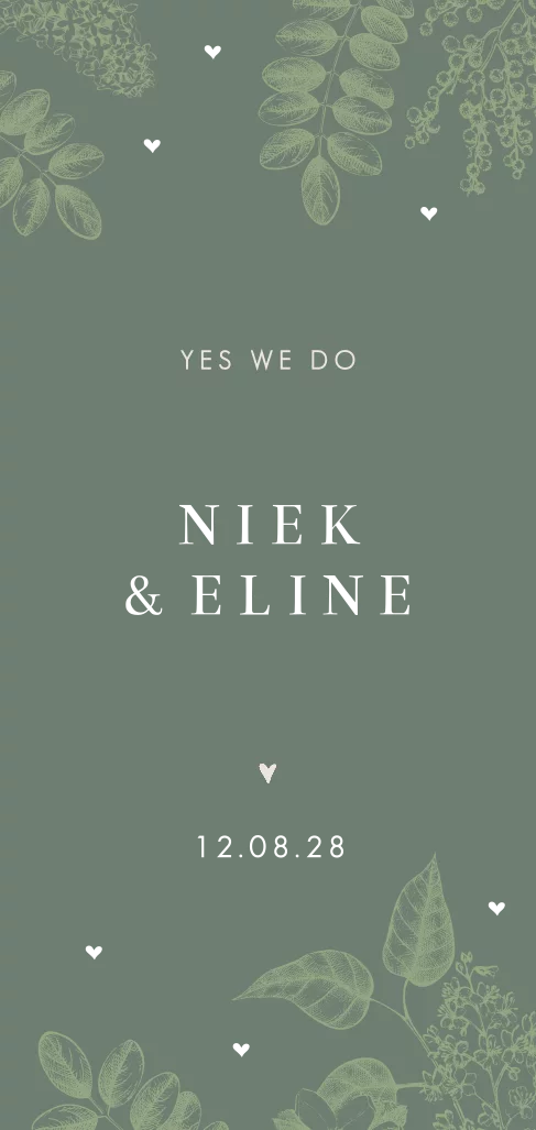 Stijlvolle trouwkaart met bloemen en ronde hoeken. De namen van het bruidspaar en de kleine hartjes op de voorzijde, worden gedrukt in echt goudfolie. De folie heeft een mooie glans en geeft de kaart extra luxe uitstraling. Een mooie combinatie met de donkergroene kleur op de achtergrond. Je kunt deze kaart zelf bewerken in de editor en naar je eigen wensen aanpassen.