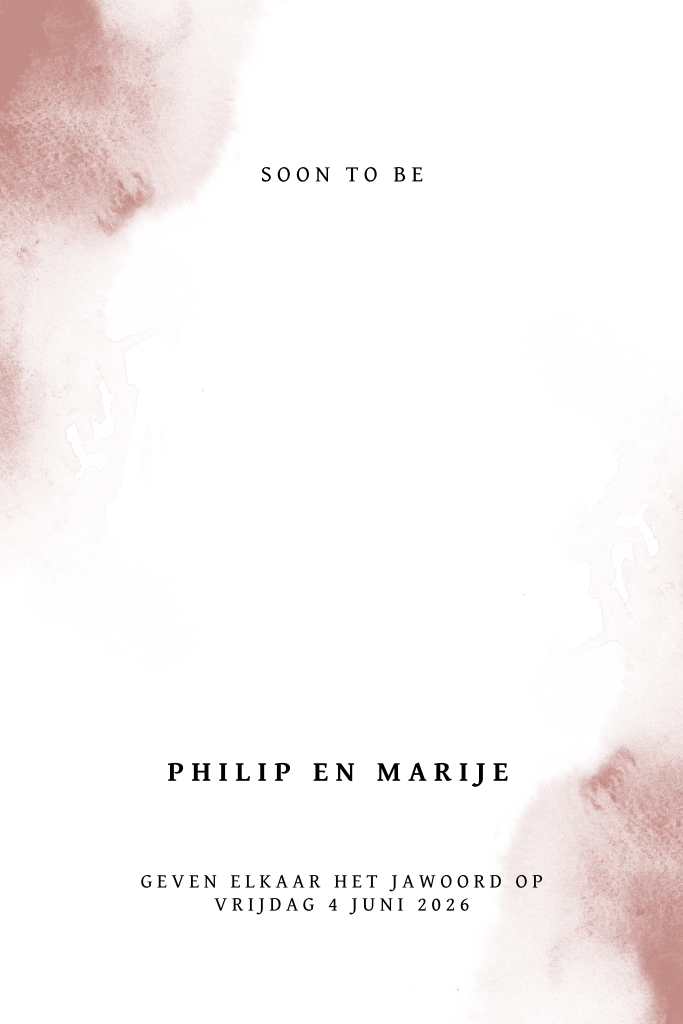 Mooie trouwkaart met aquarel vegen en ronde hoeken. De tekst Mr & Mrs staat op de voorzijde in sierlijke letters en deze worden, samen met de de kleine spetters en hartjes, gedrukt in echt zilverfolie. Je kunt deze kaart zelf bewerken in de editor en naar je eigen wensen aanpassen.
