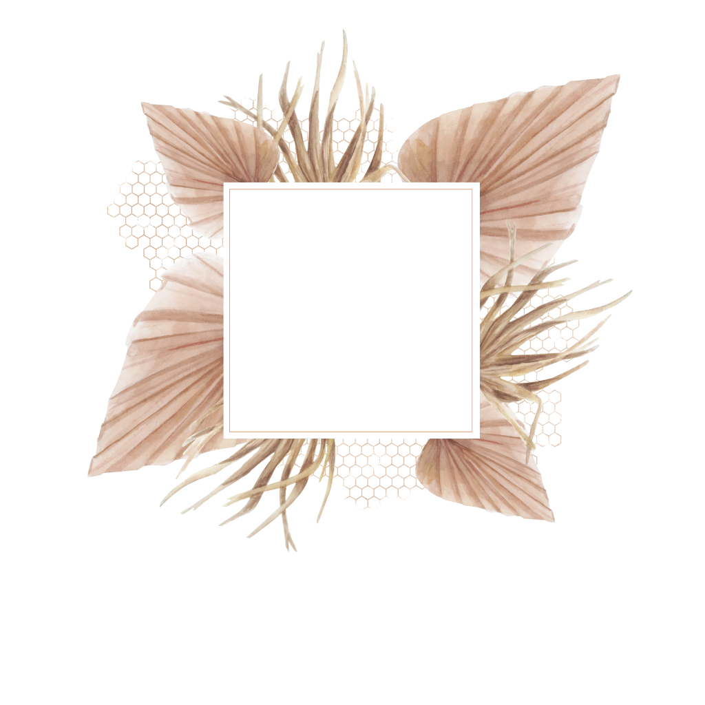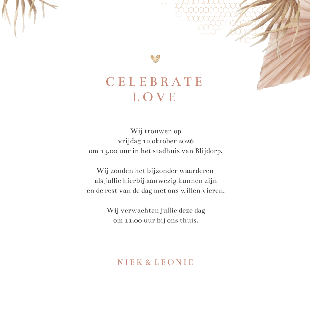Luxe trouwkaart om de gasten voor jullie bruiloft uit te nodigen. Op deze huwelijksuitnodiging staan de initialen van het bruidspaar in een wit vierkant kader, met daaromheen mooie droogbloemen en een honingraatpatroon in natuurlijke kleuren. De roséfolie elementen, waaronder de voorletters, de tekst "Yes we do" en het kleine hartje, geven deze kaart een exclusieve uitstraling.