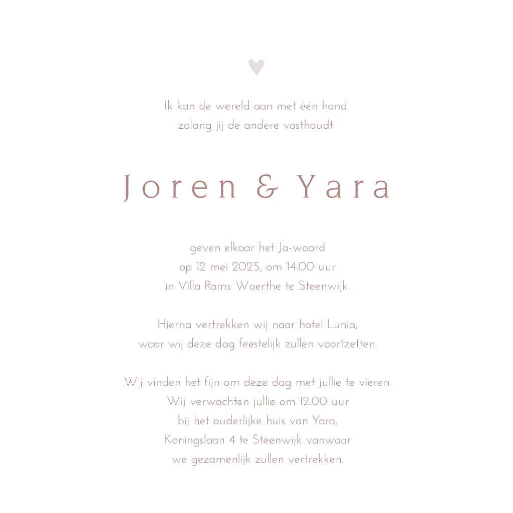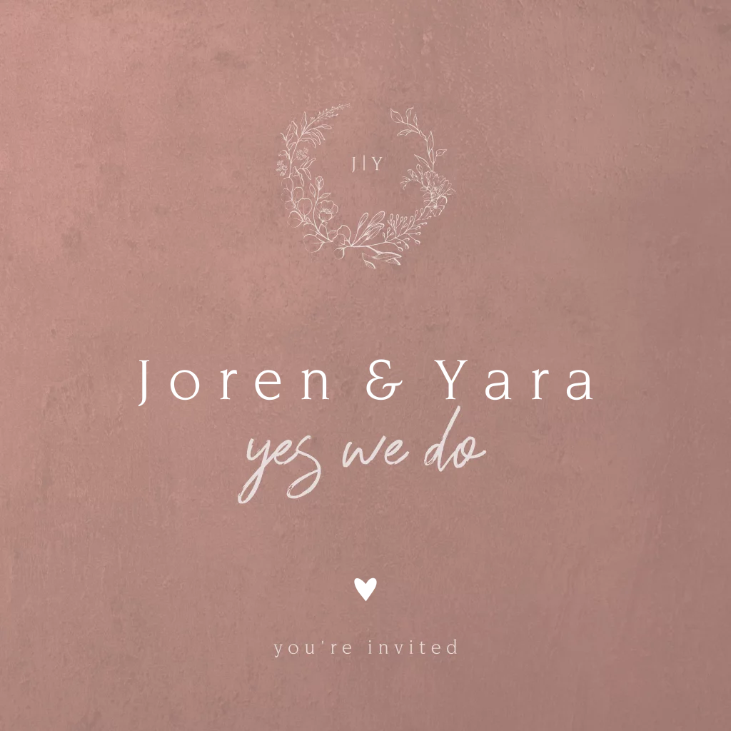 Stijlvolle uitnodiging voor jullie huwelijk met een getekende bloemenkrans en de achtergrond in trendy oudroze kleur. Door het ruwe effect op de achtergrond krijgt deze trouwkaart een vintage look. 'Yes we do' staat in het wit in handgeschreven letters. De namen van het bruidspaar worden gedrukt in roséfolie.