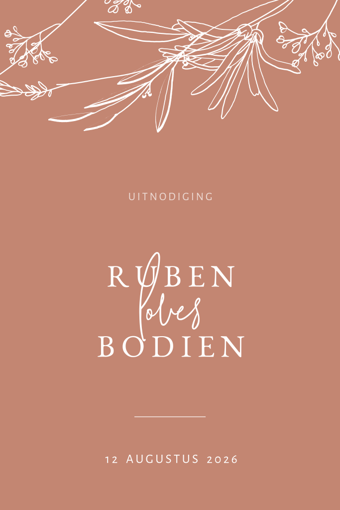 Nodig de gasten voor jullie bruiloft uit met deze rustige trouwkaart met stijlvolle gedroogde bloem takken. Deze trouwkaart is trendy door het gebruik van kleuren die helemaal van nu zijn. Doordat de takken, de namen van het bruidspaar, het strakke lijntje en de trouwdatum worden gedrukt in écht roséfolie, krijgt deze kaart een extra luxe uitstraling. De kleuren zijn naar je eigen smaak aan te passen in de editor. Ook mogelijk met goudfolie, koperfolie, zilverfolie of zwartfolie.
