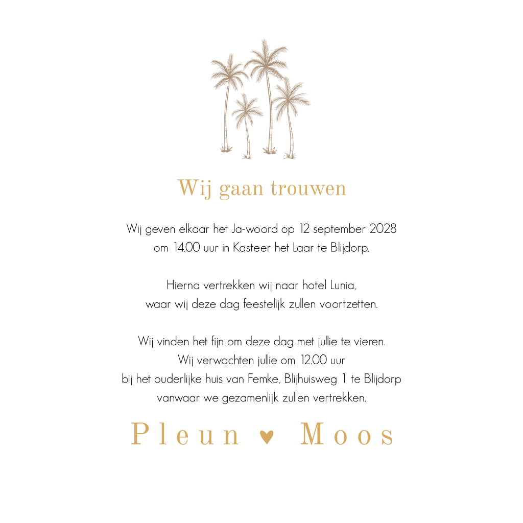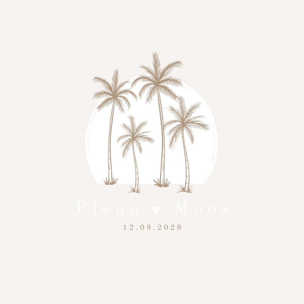 Rustige stijlvolle trouwkaart met gouden foliedruk. Deze trendy trouwkaart heeft een beach thema met zon en palmbomen. Perfect voor een zonnige zomer bruiloft! De gouden folie geeft een extra luxe touch aan deze huwelijksuitnodiging. Je kunt deze kaart zelf bewerken in de editor en naar je eigen wensen aanpassen.