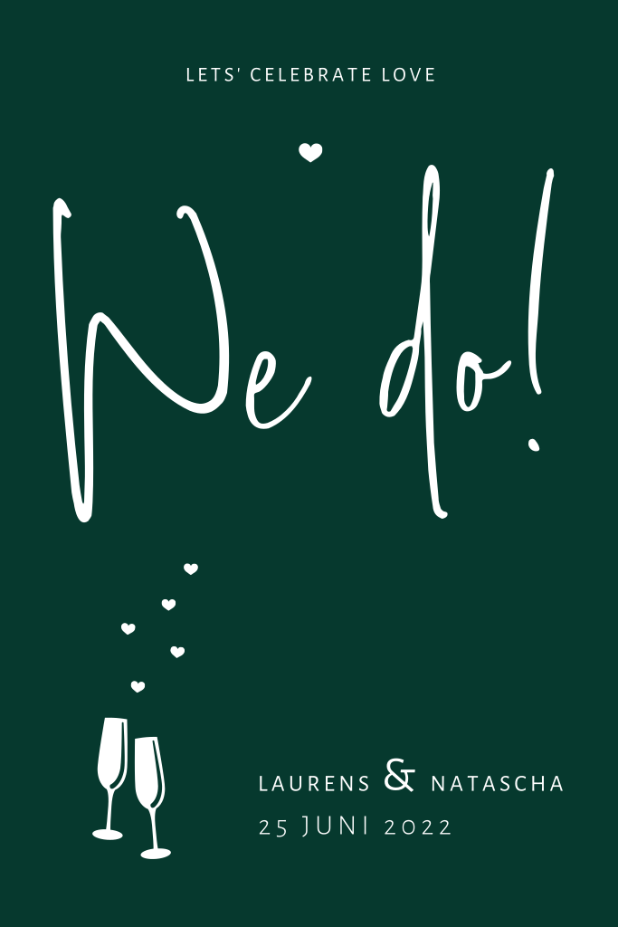 Exclusieve trouwkaart met foliedruk. Op deze uitnodiging staat in het groot We do! wat gedrukt wordt in echt zilverfolie. Ook de andere elementen in zilverkleur worden in echt zilverfolie gedrukt. Een mooie combinatie met donkergroen en wit. De kleuren zijn aan te passen in de editor. De proostende glazen maken de kaart extra feestelijk. Ook mooi met goudfolie, koperfolie of roséfolie.