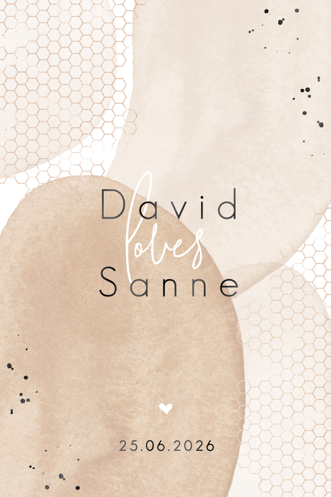 Luxe folie trouwkaart met abstracte vormen in zachte roze kleuren en een honingraat patroon. Op de voorzijde van deze huwelijksuitnodiging worden de zwarte teksten en de kleine zwarte spetters gedrukt in écht zwartfolie, dit geeft de kaart een exclusieve uitstraling. Pas deze kaart naar je eigen smaak aan in de editor.