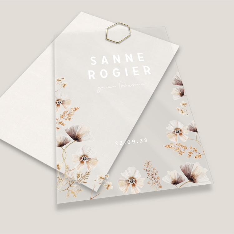 Prachtige acryl trouwkaart met veldbloemen en hartjes. Bijzonder aan deze huwelijksuitnodiging is dat deze bestaat uit twee kaartjes. Een transparante acryl cover en een achterkaart. De achterkaart heeft een rustige beige kleur. Zet op de achterzijde van de achterkaart alle informatie over jullie grote dag.