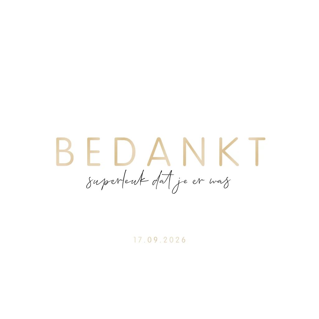 Bijzonder bedankkaartje in aparte vorm, speciaal voor alle gasten op jullie onvergetelijke dag! Dit bedankkaartje is gesneden in een ovale vorm. Elementen worden gedrukt in hoogglans, waardoor dit kaartje echte luxe uitstraalt. Pas deze kaart naar eigen smaak aan in de editor, ook mogelijk met zilverfolie, goudfolie, roséfolie. Hulp nodig bij het ontwerpen? Laat het ons gerust weten.