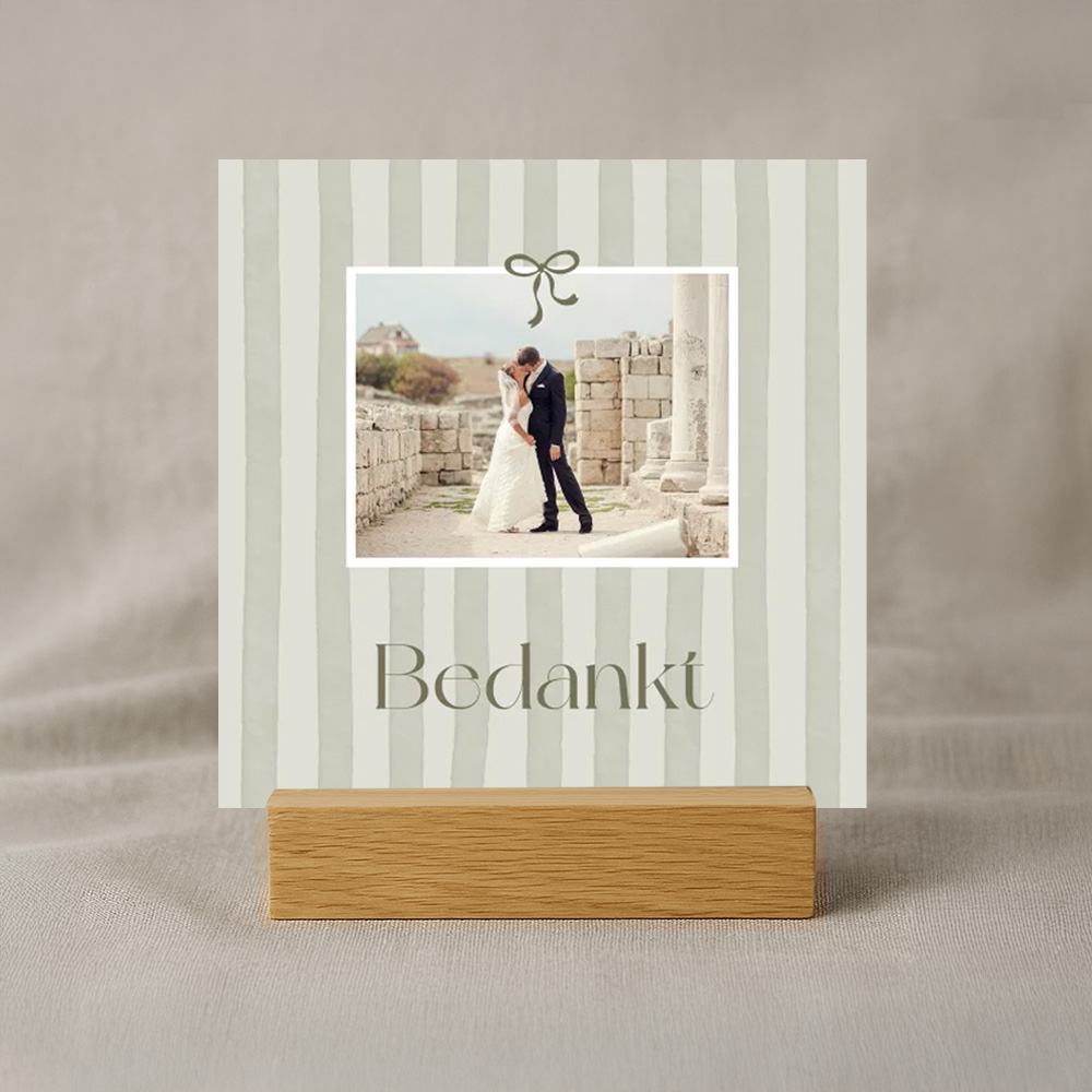Bedank al jullie bruiloftsgasten met deze trendy bedankkaart met strepen en een foto. Zet een mooie foto van jullie als pasgetrouwd stel op de kaart. Teksten en kleuren zijn makkelijk aan te passen in onze editor. Hulp nodig? We staan voor je klaar!